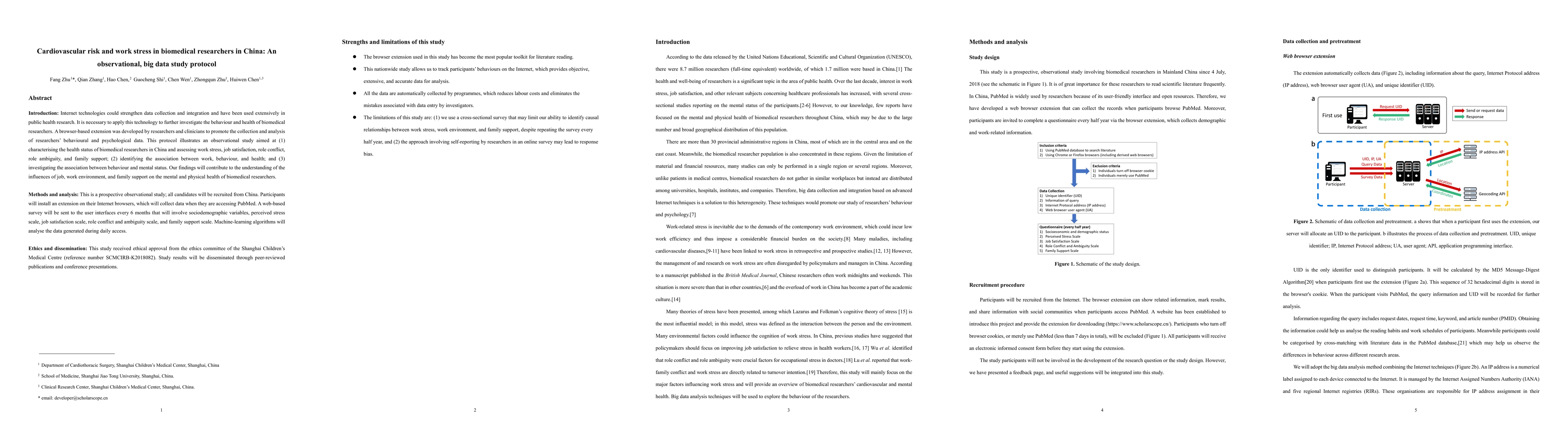 Introduction: Internet technologies could strengthen data collection and integration and have been used extensively in public health research. It is necessary to apply this technology to further investigate the behaviour and health of biomedical researchers. A browser-based extension was developed by researchers and clinicians to promote the collection and analysis of researchers' behavioural and psychological data. This protocol illustrates an observational study aimed at (1) characterising the health status of biomedical researchers in China and assessing work stress, job satisfaction, role conflict, role ambiguity, and family support; (2) identifying the association between work, behaviour, and health; and (3) investigating the association between behaviour and mental status. Our findings will contribute to the understanding of the influences of job, work environment, and family support on the mental and physical health of biomedical researchers. Methods and analysis: This is a prospective observational study; all candidates will be recruited from China. Participants will install an extension on their Internet browsers, which will collect data when they are accessing PubMed. A web-based survey will be sent to the user interfaces every 6 months that will involve sociodemographic variables, perceived stress scale, job satisfaction scale, role conflict and ambiguity scale, and family support scale. Machine-learning algorithms will analyse the data generated during daily access. Ethics and dissemination: This study received ethical approval from the ethics committee of the Shanghai Children's Medical Centre (reference number SCMCIRB-K2018082). Study results will be disseminated through peer-reviewed publications and conference presentations.