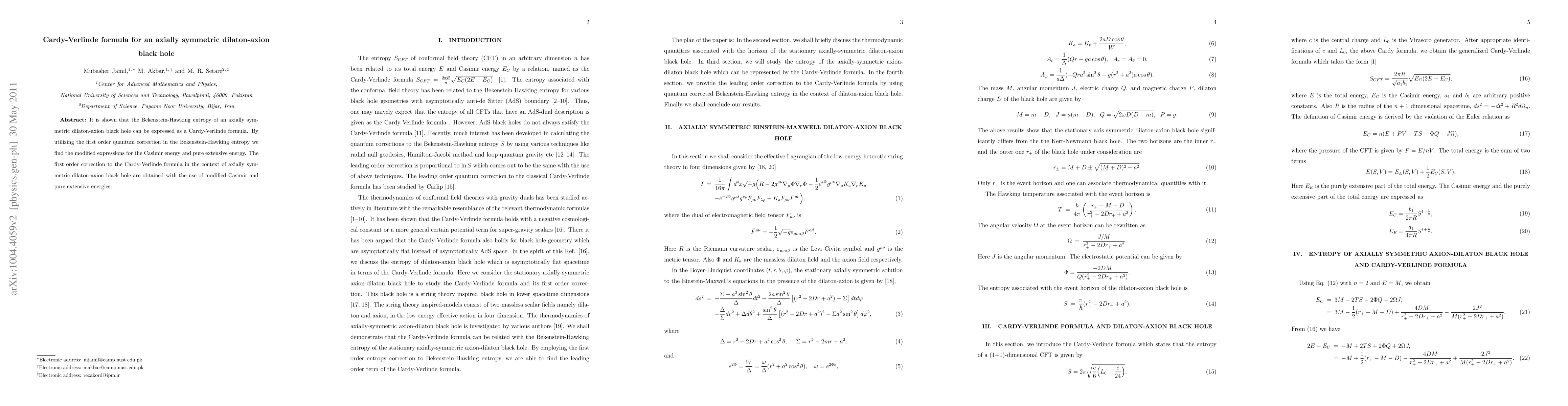 This paper demonstrates that the Bekenstein-Hawking entropy of an axially symmetric dilaton-axion black hole can be represented using the Cardy-Verlinde formula. It also derives first-order quantum corrections to the Bekenstein-Hawking entropy, leading to modified expressions for Casimir and pure extensive energies.