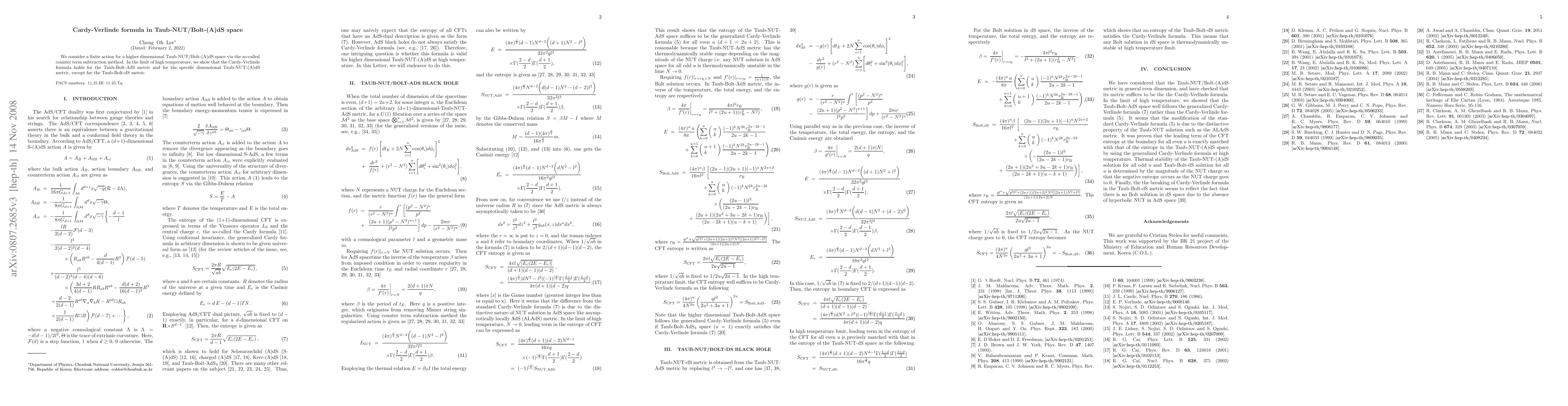 This research applies the counter term subtraction method to derive a finite action for Taub-NUT/Bolt-(A)dS space and demonstrates the validity of the Cardy-Verlinde formula in high-temperature limits for Taub-Bolt-AdS and Taub-NUT-(A)dS metrics, excluding Taub-Bolt-dS.