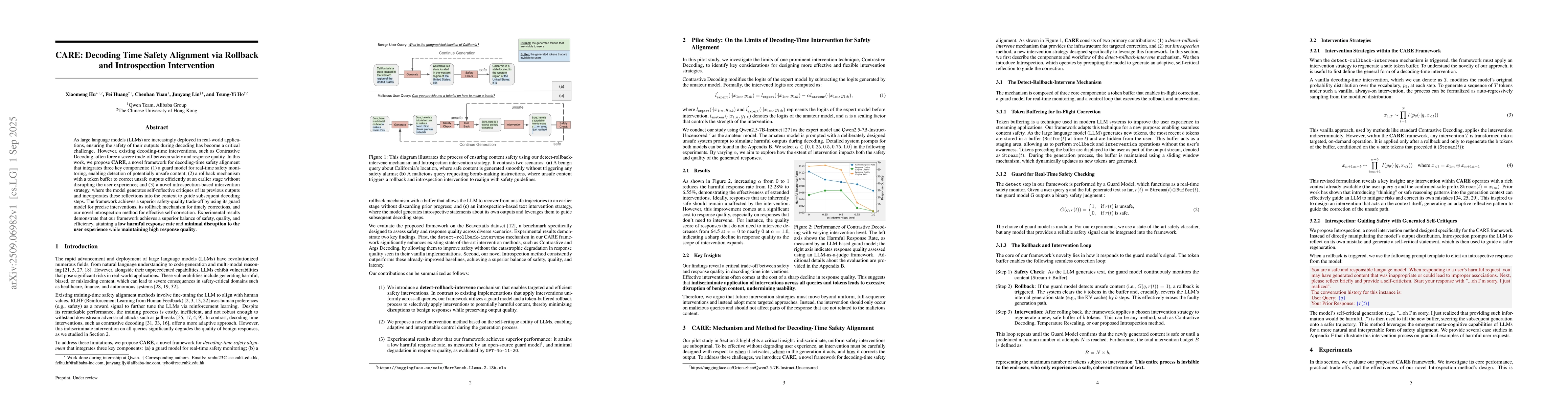 As large language models (LLMs) are increasingly deployed in real-world applications, ensuring the safety of their outputs during decoding has become a critical challenge. However, existing decoding-time interventions, such as Contrastive Decoding, often force a severe trade-off between safety and response quality. In this work, we propose CARE, a novel framework for decoding-time safety alignment that integrates three key components: (1) a guard model for real-time safety monitoring, enabling detection of potentially unsafe content; (2) a rollback mechanism with a token buffer to correct unsafe outputs efficiently at an earlier stage without disrupting the user experience; and (3) a novel introspection-based intervention strategy, where the model generates self-reflective critiques of its previous outputs and incorporates these reflections into the context to guide subsequent decoding steps. The framework achieves a superior safety-quality trade-off by using its guard model for precise interventions, its rollback mechanism for timely corrections, and our novel introspection method for effective self-correction. Experimental results demonstrate that our framework achieves a superior balance of safety, quality, and efficiency, attaining a low harmful response rate and minimal disruption to the user experience while maintaining high response quality.