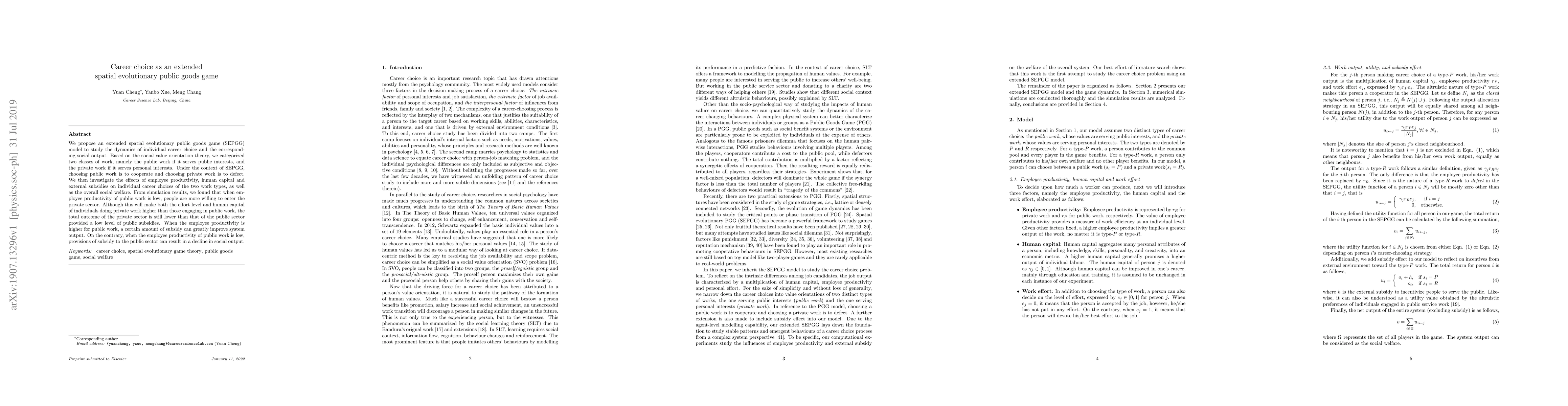 We propose an extended spatial evolutionary public goods game (SEPGG) model to study the dynamics of individual career choice and the corresponding social output. Based on the social value orientation theory, we categorized two classes of work, namely the public work if it serves public interests, and the private work if it serves personal interests. Under the context of SEPGG, choosing public work is to cooperate and choosing private work is to defect. We then investigate the effects of employee productivity, human capital and external subsidies on individual career choices of the two work types, as well as the overall social welfare. From simulation results, we found that when employee productivity of public work is low, people are more willing to enter the private sector. Although this will make both the effort level and human capital of individuals doing private work higher than those engaging in public work, the total outcome of the private sector is still lower than that of the public sector provided a low level of public subsidies. When the employee productivity is higher for public work, a certain amount of subsidy can greatly improve system output. On the contrary, when the employee productivity of public work is low, provisions of subsidy to the public sector can result in a decline in social output.