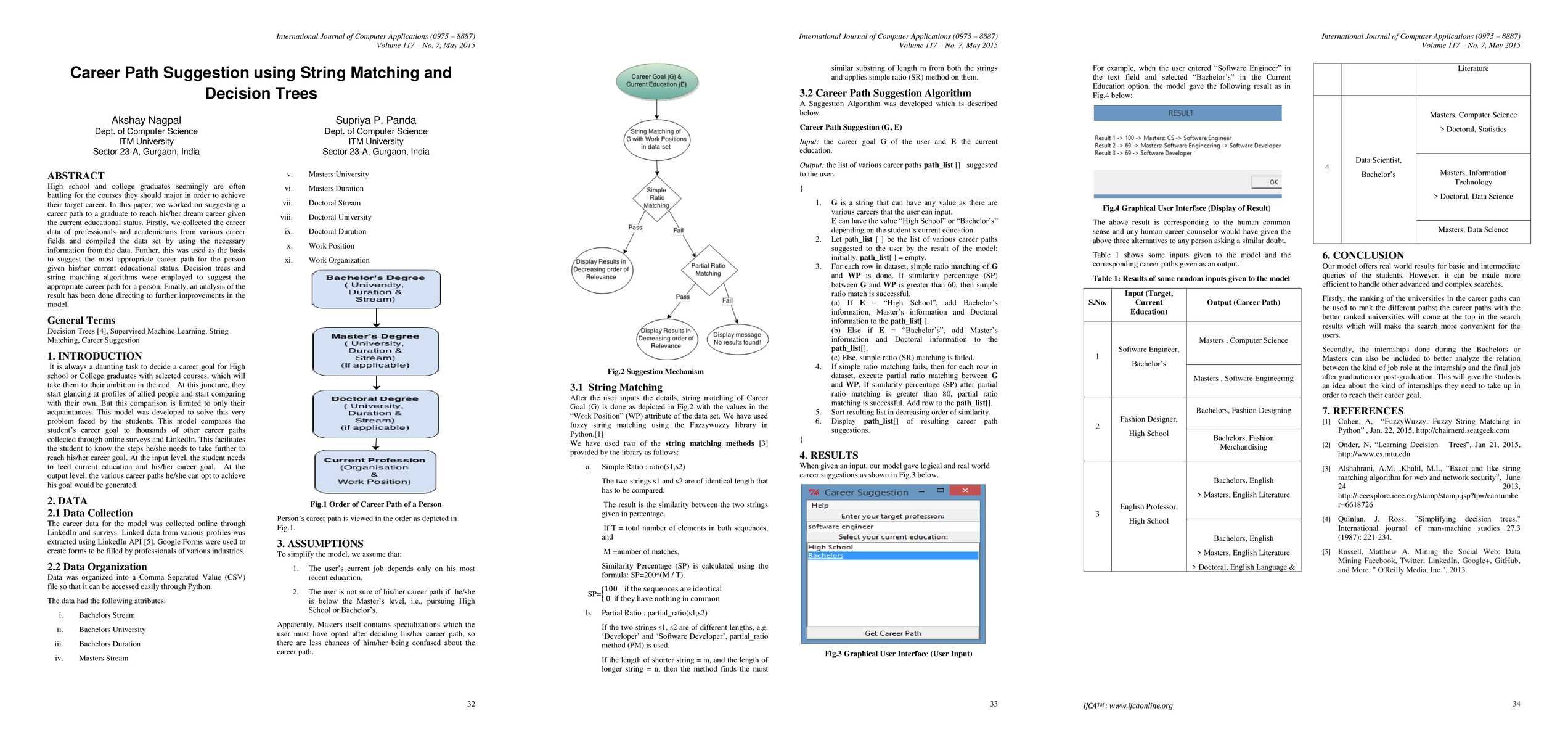 This paper proposes a method using decision trees and string matching algorithms to suggest career paths for graduates based on their current educational status. The authors compiled a dataset of professional career data and employed these techniques to recommend the most suitable career path, followed by an analysis to identify potential improvements.