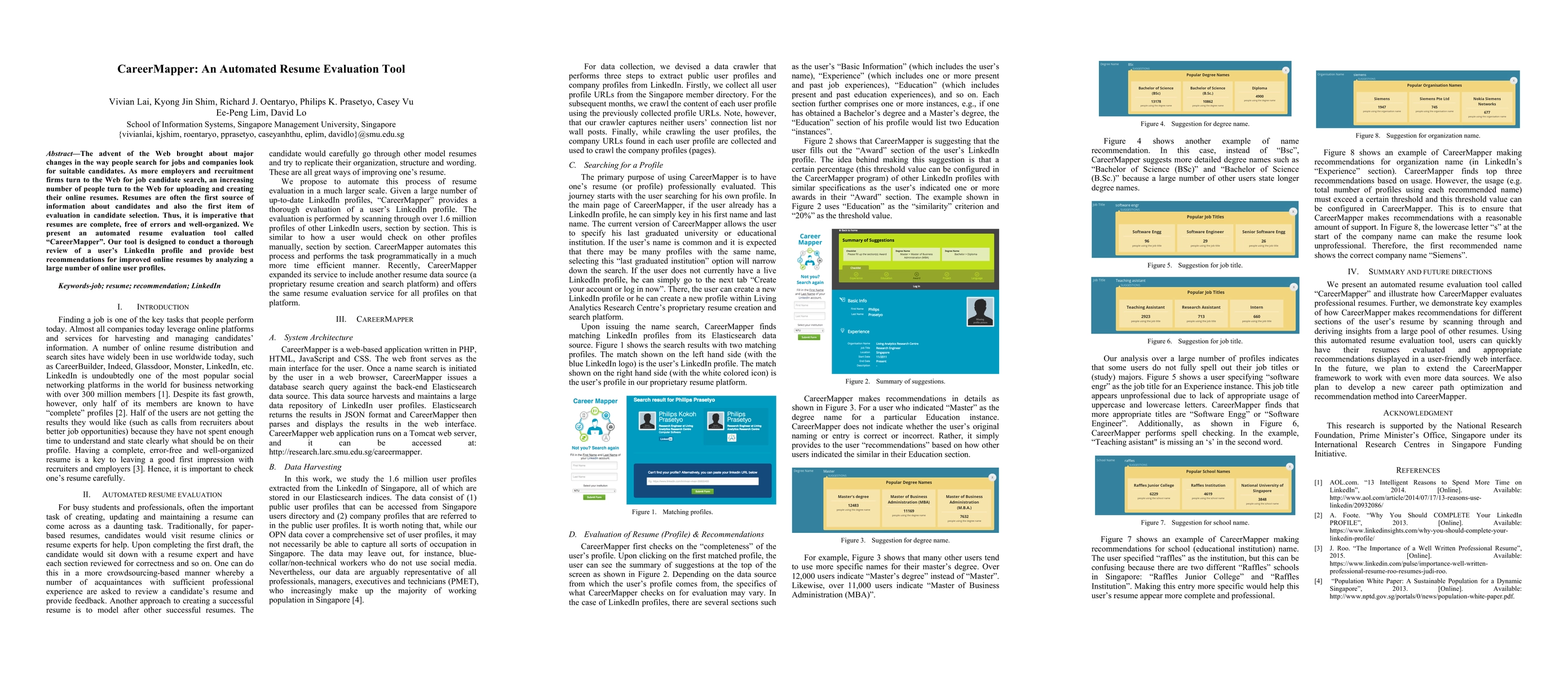 The advent of the Web brought about major changes in the way people search for jobs and companies look for suitable candidates. As more employers and recruitment firms turn to the Web for job candidate search, an increasing number of people turn to the Web for uploading and creating their online resumes. Resumes are often the first source of information about candidates and also the first item of evaluation in candidate selection. Thus, it is imperative that resumes are complete, free of errors and well-organized. We present an automated resume evaluation tool called "CareerMapper". Our tool is designed to conduct a thorough review of a user's LinkedIn profile and provide best recommendations for improved online resumes by analyzing a large number of online user profiles.