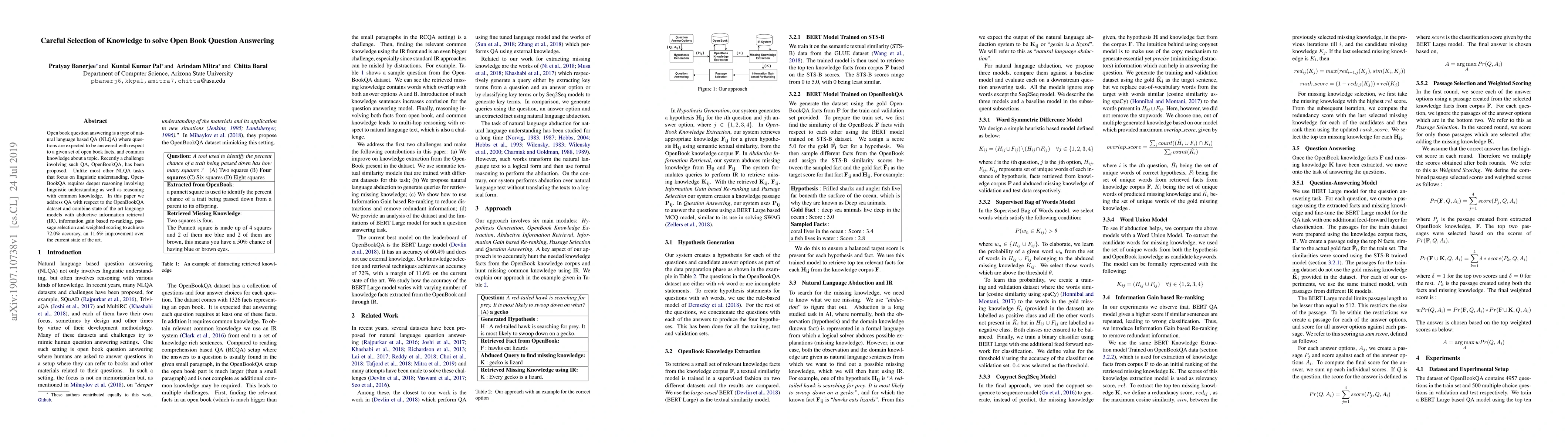 Open book question answering is a type of natural language based QA (NLQA) where questions are expected to be answered with respect to a given set of open book facts, and common knowledge about a topic. Recently a challenge involving such QA, OpenBookQA, has been proposed. Unlike most other NLQA tasks that focus on linguistic understanding, OpenBookQA requires deeper reasoning involving linguistic understanding as well as reasoning with common knowledge. In this paper we address QA with respect to the OpenBookQA dataset and combine state of the art language models with abductive information retrieval (IR), information gain based re-ranking, passage selection and weighted scoring to achieve 72.0% accuracy, an 11.6% improvement over the current state of the art.