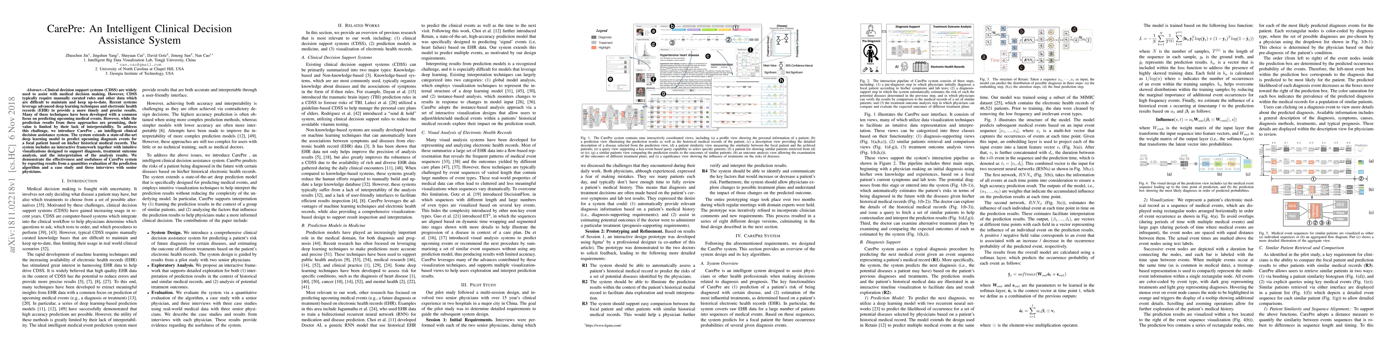 Clinical decision support systems (CDSS) are widely used to assist with medical decision making. However, CDSS typically require manually curated rules and other data which are difficult to maintain and keep up-to-date. Recent systems leverage advanced deep learning techniques and electronic health records (EHR) to provide more timely and precise results. Many of these techniques have been developed with a common focus on predicting upcoming medical events. However, while the prediction results from these approaches are promising, their value is limited by their lack of interpretability. To address this challenge, we introduce CarePre, an intelligent clinical decision assistance system. The system extends a state-of-the-art deep learning model to predict upcoming diagnosis events for a focal patient based on his/her historical medical records. The system includes an interactive framework together with intuitive visualizations designed to support the diagnosis, treatment outcome analysis, and the interpretation of the analysis results. We demonstrate the effectiveness and usefulness of CarePre system by reporting results from a quantities evaluation of the prediction algorithm and a case study and three interviews with senior physicians.