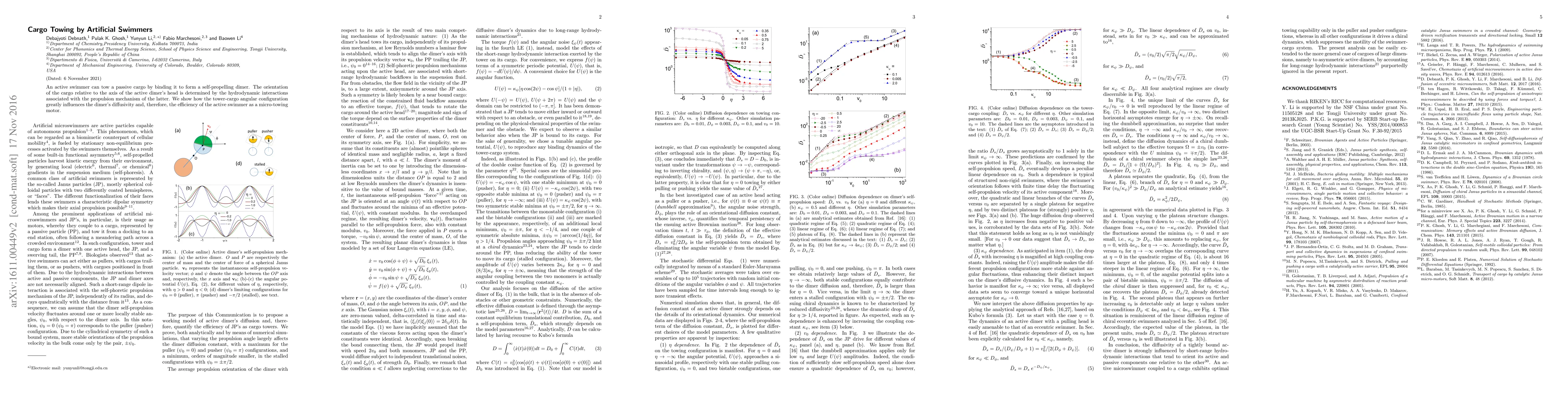 This paper investigates how artificial swimmers can tow passive cargo by forming self-propelled dimers, highlighting that the cargo's orientation relative to the swimmer's head affects the dimer's diffusivity and towing efficiency. The study reveals the significant influence of the tower-cargo angular configuration on the overall performance of the micro-towing motor.