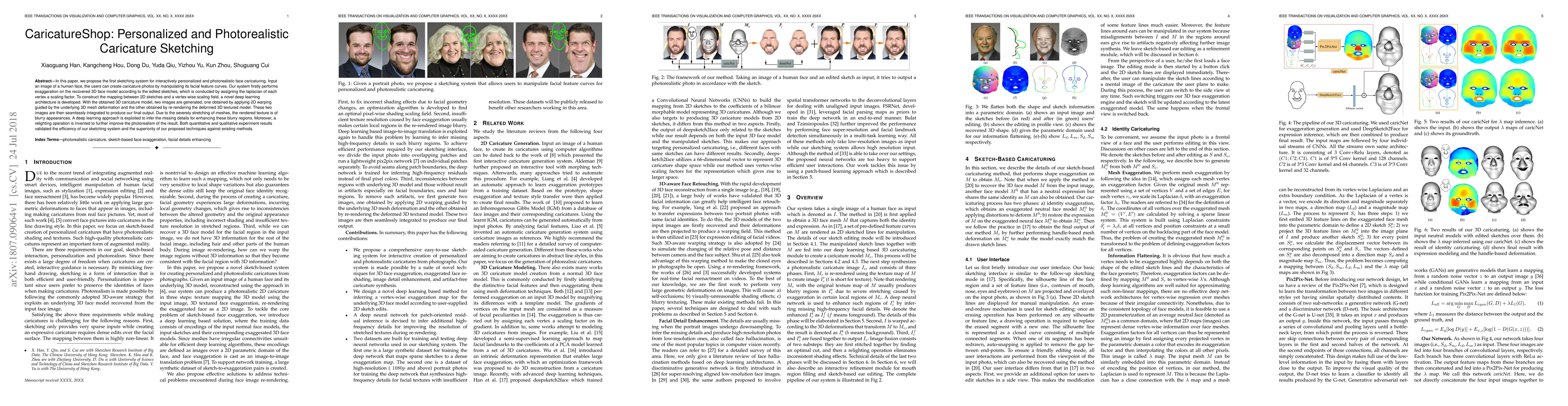This paper introduces a system for creating personalized and photorealistic caricature sketches from input images of human faces. It achieves this through a novel deep learning architecture that combines 2D warping with re-rendering and relighting to produce high-quality results.