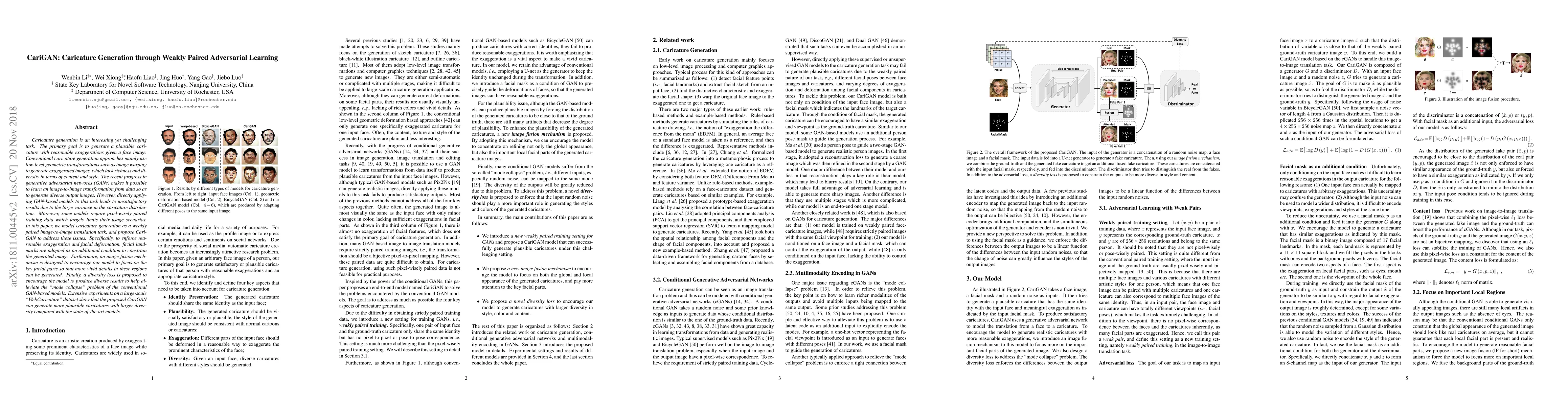 Caricature generation is an interesting yet challenging task. The primary goal is to generate plausible caricatures with reasonable exaggerations given face images. Conventional caricature generation approaches mainly use low-level geometric transformations such as image warping to generate exaggerated images, which lack richness and diversity in terms of content and style. The recent progress in generative adversarial networks (GANs) makes it possible to learn an image-to-image transformation from data, so that richer contents and styles can be generated. However, directly applying the GAN-based models to this task leads to unsatisfactory results because there is a large variance in the caricature distribution. Moreover, some models require strictly paired training data which largely limits their usage scenarios. In this paper, we propose CariGAN overcome these problems. Instead of training on paired data, CariGAN learns transformations only from weakly paired images. Specifically, to enforce reasonable exaggeration and facial deformation, facial landmarks are adopted as an additional condition to constrain the generated image. Furthermore, an attention mechanism is introduced to encourage our model to focus on the key facial parts so that more vivid details in these regions can be generated. Finally, a Diversity Loss is proposed to encourage the model to produce diverse results to help alleviate the `mode collapse' problem of the conventional GAN-based models. Extensive experiments on a new large-scale `WebCaricature' dataset show that the proposed CariGAN can generate more plausible caricatures with larger diversity compared with the state-of-the-art models.