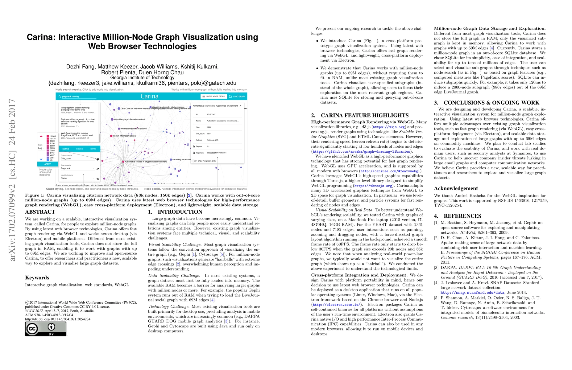Carina is an interactive visualization system for exploring million-node graphs using web technologies, offering fast rendering via WebGL and scalability across desktop and mobile platforms. Unlike traditional tools, it avoids storing the entire graph in RAM, enabling it to handle graphs with up to 69M edges.
