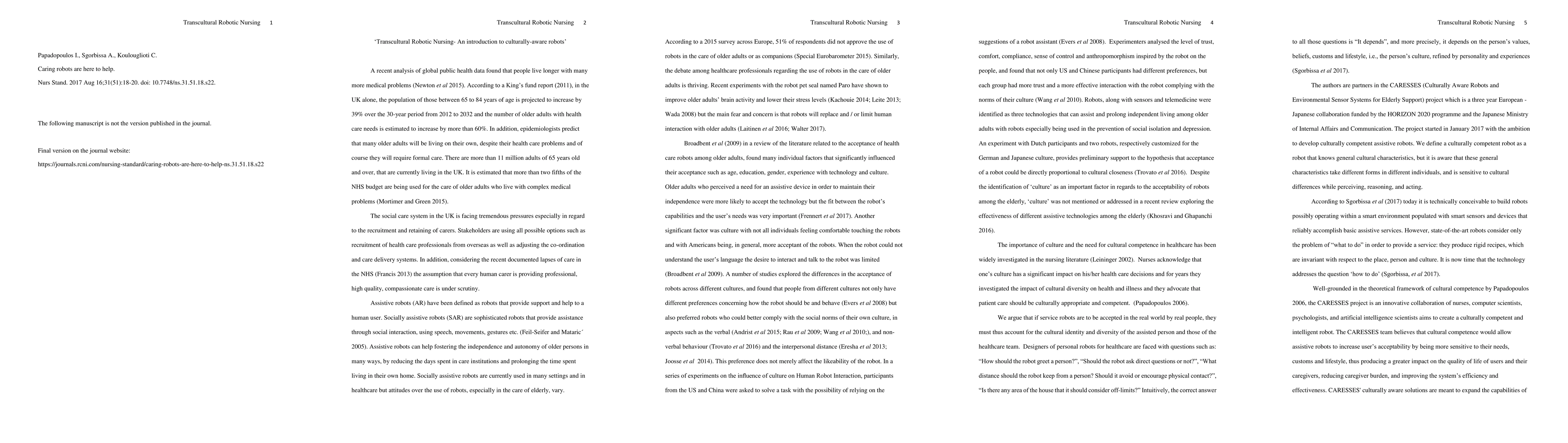 Robots have been identified as a technology that can assist older people with social isolation and depression, helping them to live independently for longer. Caring robots are being used in conjunction with sensors and telemedicine to provide support and prolong independent living.