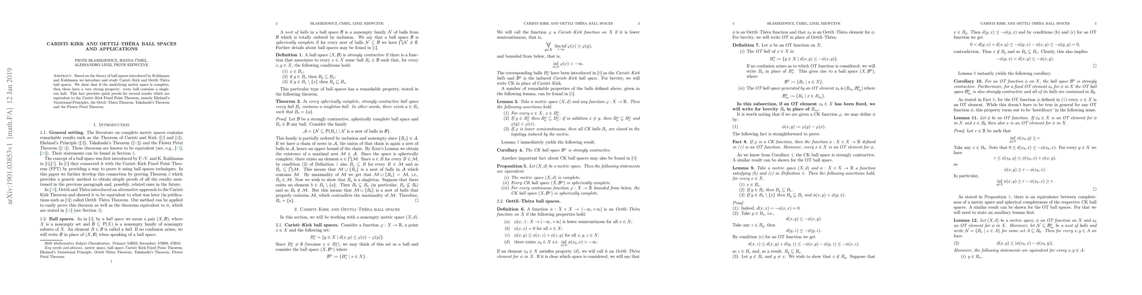 This paper introduces and explores Caristi-Kirk and Oettli-Théra ball spaces, demonstrating that complete underlying metric spaces exhibit the strong property where every ball contains a singleton ball. This property facilitates rapid proofs for several fixed point theorems, including Ekeland's Variational Principles and the Oettli-Théra Theorem.