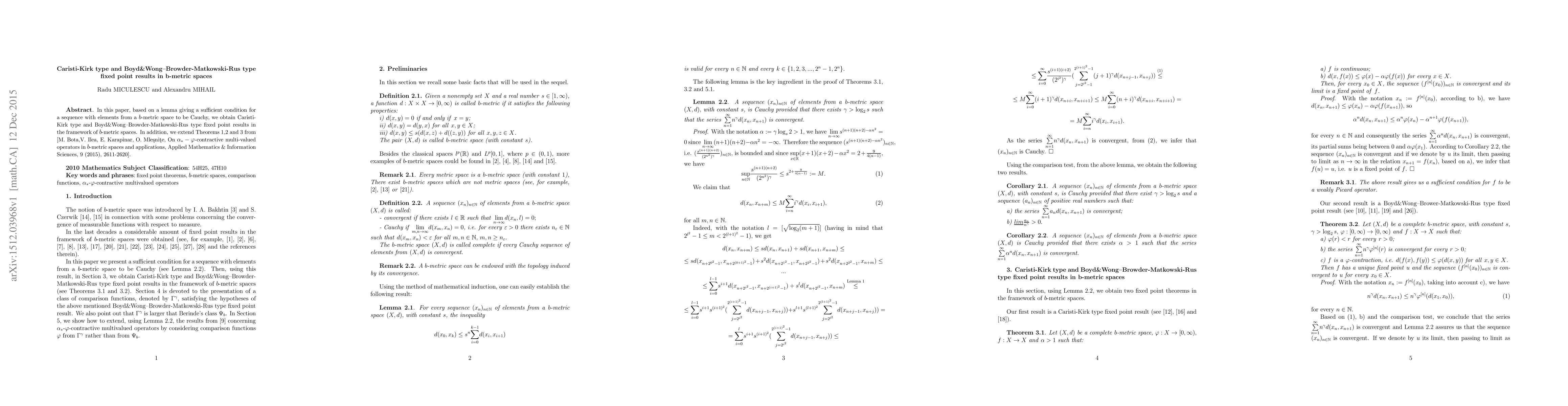 In this paper, based on a lemma giving a sufficient condition for a sequence with elements from a b-metric space to be Cauchy, we obtain Caristi-Kirk type and Boyd&Wong-Browder-Matkowski-Rus type fixed point results in the framework of b-metric spaces. In addition, we extend Theorems 1,2 and 3 from [M. Bota,V. Ilea, E. Karapinar, O. Mlesnite, On alpha-star-phi-contractive multi-valued operators in b-metric spaces and applications, Applied Mathematics & Information Sciences, 9 (2015), 2611-2620].
