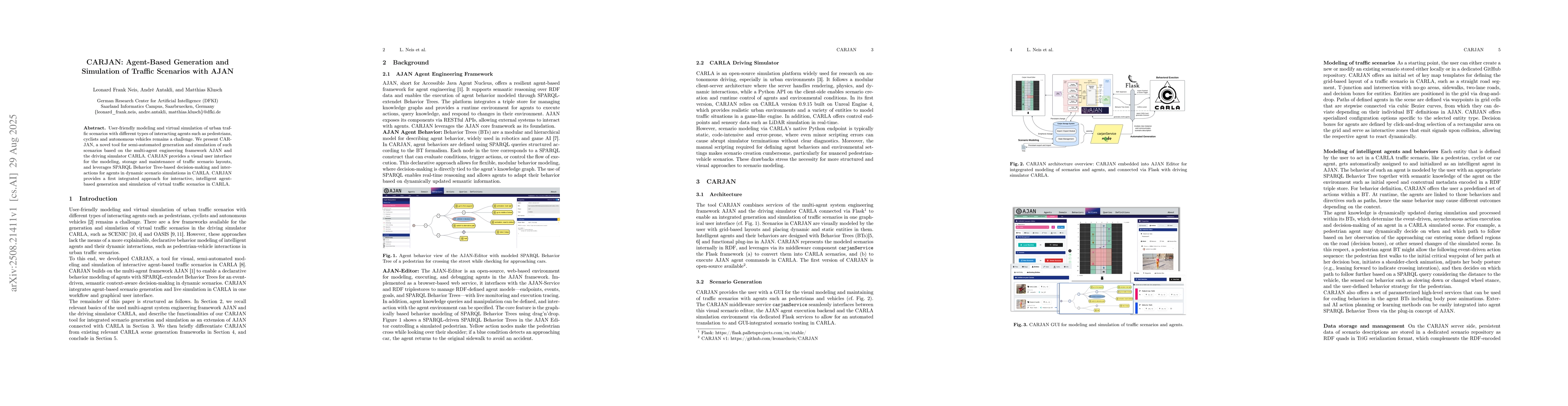 User-friendly modeling and virtual simulation of urban traffic scenarios with different types of interacting agents such as pedestrians, cyclists and autonomous vehicles remains a challenge. We present CARJAN, a novel tool for semi-automated generation and simulation of such scenarios based on the multi-agent engineering framework AJAN and the driving simulator CARLA. CARJAN provides a visual user interface for the modeling, storage and maintenance of traffic scenario layouts, and leverages SPARQL Behavior Tree-based decision-making and interactions for agents in dynamic scenario simulations in CARLA. CARJAN provides a first integrated approach for interactive, intelligent agent-based generation and simulation of virtual traffic scenarios in CARLA.