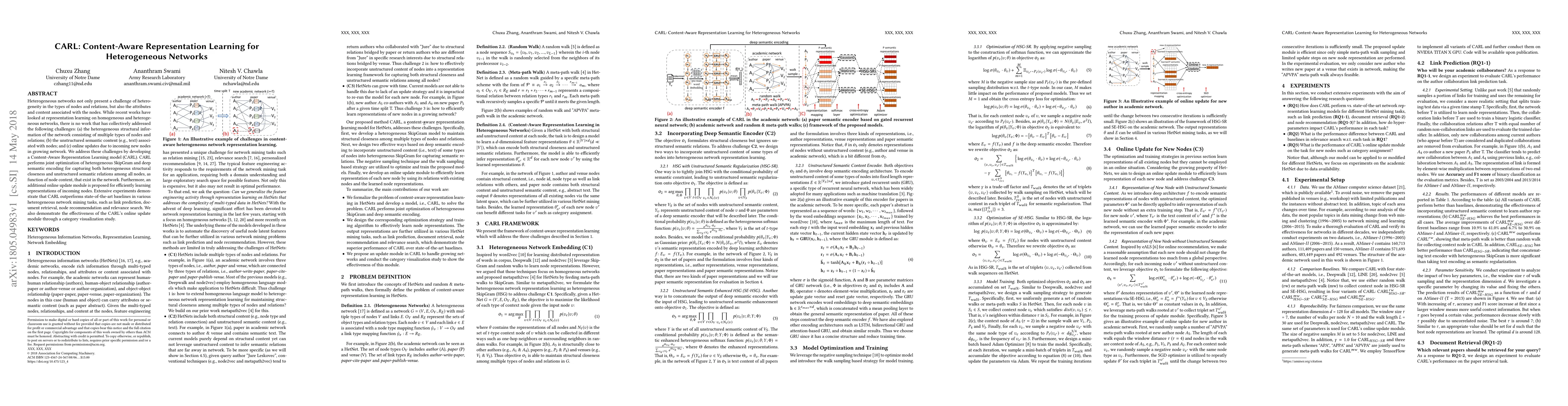 CARL is a novel Content-Aware Representation Learning model designed to address representation learning challenges in heterogeneous networks, optimizing both structural and semantic content. It outperforms existing methods in tasks like link prediction and node recommendation.