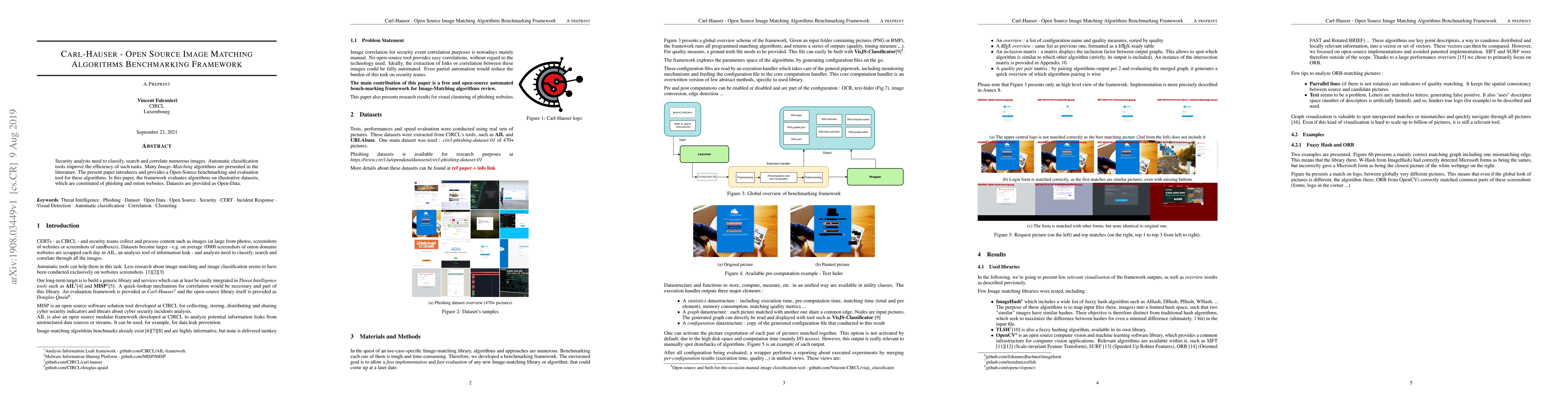 Security analysts need to classify, search and correlate numerous images. Automatic classification tools improve the efficiency of such tasks. Many Image-Matching algorithms are presented in the litterature. The present paper introduces and provides a Open-Source benchmarking and evaluation tool for these algorithms. Is this paper, the framework evaluates algorithms on illustrative datasets, which are constituted of phishing and onion websites. Datasets are provided as Open-Data.