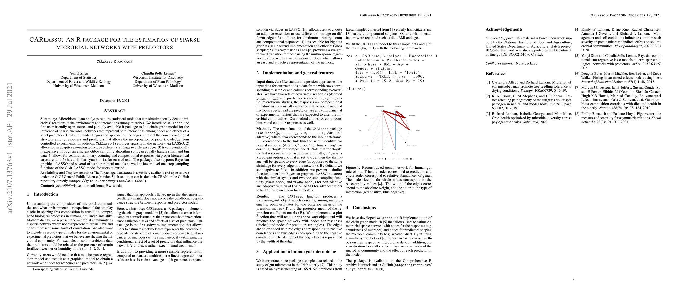 CARlasso is an R package for estimating sparse microbial networks that incorporate environmental predictors. It uses a chain graph model to infer microbial interactions and effects of predictors, enforcing sparsity via LASSO and supporting various response types through hierarchical structure.