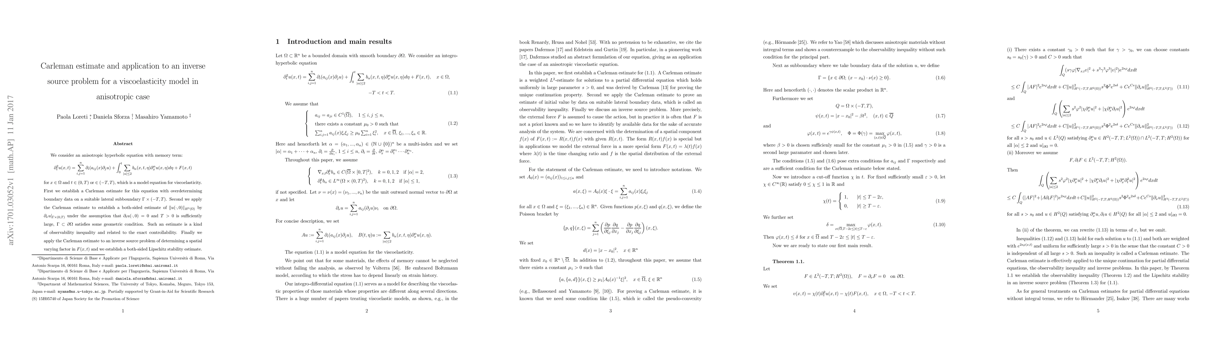 We consider an anisotropic hyperbolic equation with memory term: $$ \partial_t^2 u(x,t) = \sum_{i,j=1}^n \partial_i(a_{ij}(x)\partial_ju) + \int^t_0 \sum_{| \alpha| \le 2} b_{\alpha}(x,t,\eta)\partial_x^{\alpha}u(x,\eta) d\eta + F(x,t) $$ for $x \in \Omega$ and $t\in (0,T)$ or $\in (-T,T)$, which is a model equation for viscoelasticity. First we establish a Carleman estimate for this equation with overdetermining boundary data on a suitable lateral subboundary $\Gamma \times (-T,T)$. Second we apply the Carleman estimate to establish a both-sided estimate of $| u(\cdot,0)|_{H^3(\Omega)}$ by $\partial_{\nu}u|_{\Gamma\times (0,T)}$ under the assumption that $\partial_tu(\cdot,0) = 0$ and $T>0$ is sufficiently large, $\Gamma \subset \partial\Omega$ satisfies some geometric condition. Such an estimate is a kind of observability inequality and related to the exact controllability. Finally we apply the Carleman estimate to an inverse source problem of determining a spatial varying factor in $F(x,t)$ and we establish a both-sided Lipschitz stability estimate.