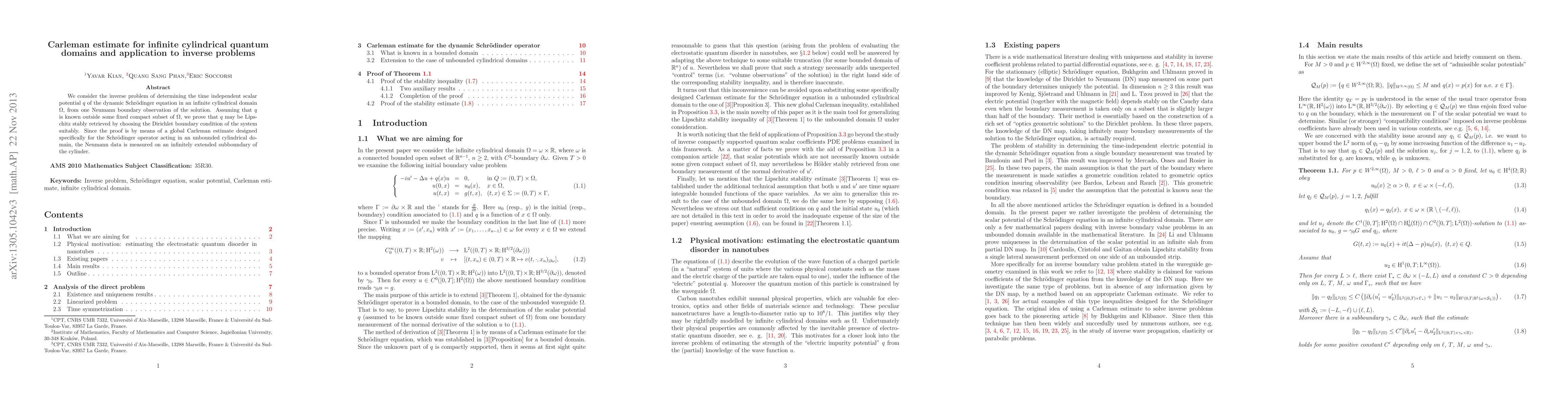 This paper proves a Carleman estimate for the Schrödinger operator in an infinite cylindrical domain, and uses it to show that the time-independent scalar potential can be Lipschitz stably retrieved from Neumann boundary data, assuming the potential is known outside a fixed compact subset.