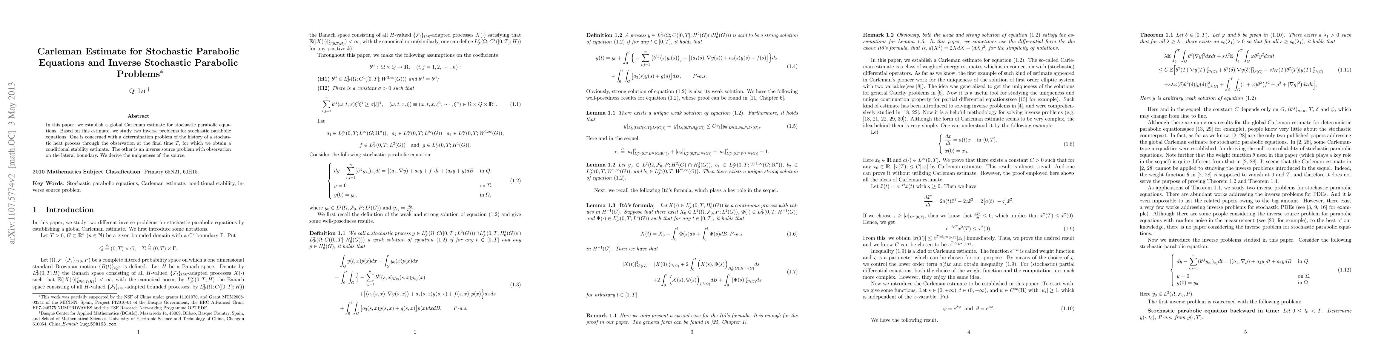 This paper establishes a global Carleman estimate for stochastic parabolic equations and utilizes it to solve two inverse problems: determining the history of a stochastic heat process from final time observations and solving an inverse source problem with boundary observations, achieving conditional stability and source uniqueness.