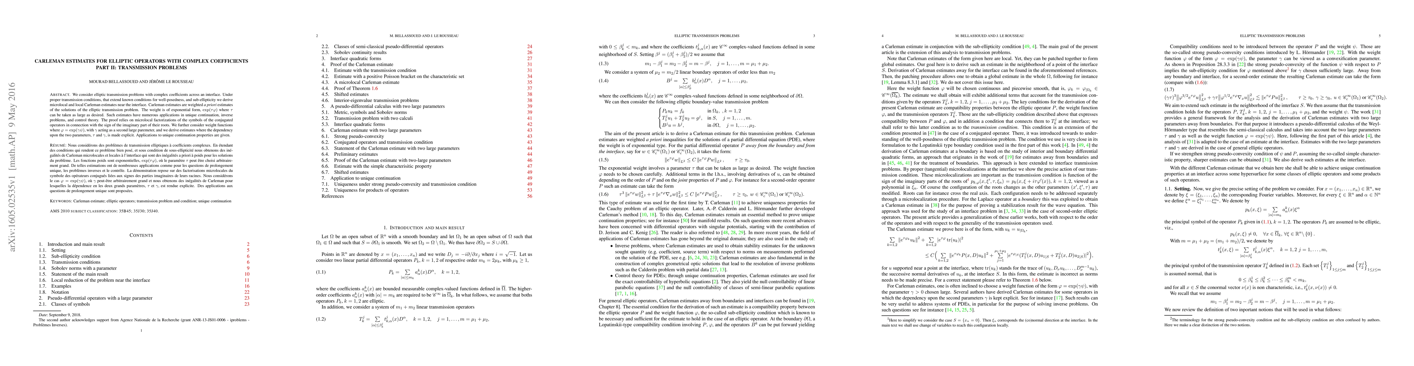 We consider elliptic transmission problems with complex coefficients across an interface. Under proper transmission conditions, that extend known conditions for well-posedness, and sub-ellipticity we derive microlocal and local Carleman estimates near the interface. Carleman estimates are weighted a priori estimates of the solutions of the elliptic transmission problem. The weight is of exponential form, exp($tau$ {\phi}) where $tau$ can be taken as large as desired. Such estimates have numerous applications in unique continuation, inverse problems, and control theory. The proof relies on microlocal factorizations of the symbols of the conjugated operators in connection with the sign of the imaginary part of their roots. We further consider weight functions where {\phi} = exp($\gamma$$\psi$), with $\gamma$ acting as a second large paremeter, and we derive estimates where the dependency upon the two parameters, $tau$ and $\gamma$, is made explicit. Applications to unique continuation properties are given.