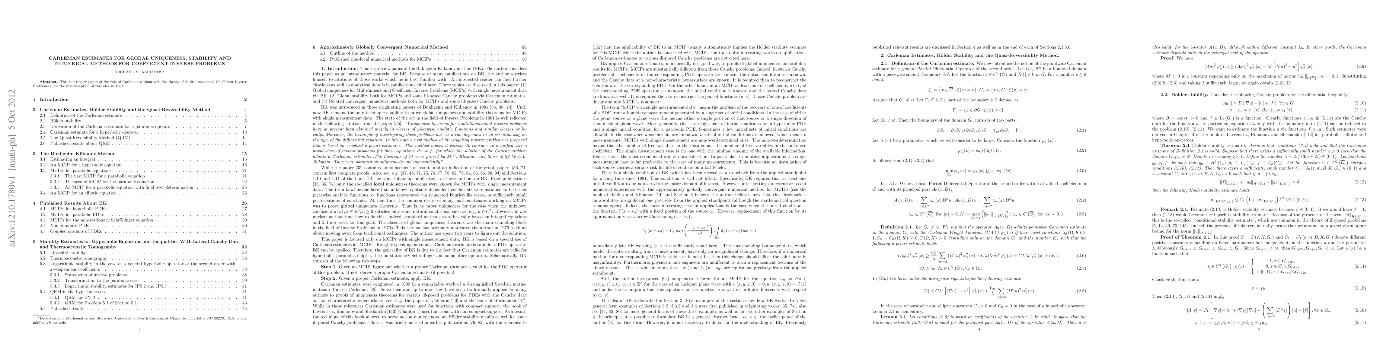 This review paper discusses Carleman estimates for solving coefficient inverse problems, a key area of research in mathematics and engineering. It highlights the significance of these estimates for ensuring global uniqueness, stability, and efficient numerical methods.