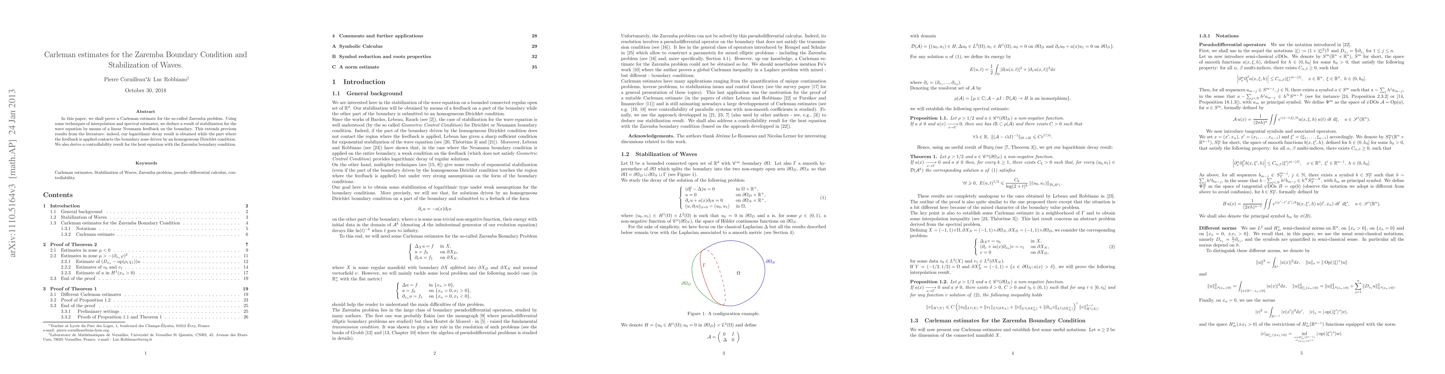 This paper proves a Carleman estimate for the Zaremba problem and uses it to demonstrate stabilization of the wave equation via linear Neumann boundary feedback. The result extends prior work by achieving logarithmic decay even when the feedback interacts with a boundary zone under an homogeneous Dirichlet condition, and it also establishes controllability for the heat equation with the Zaremba boundary condition.