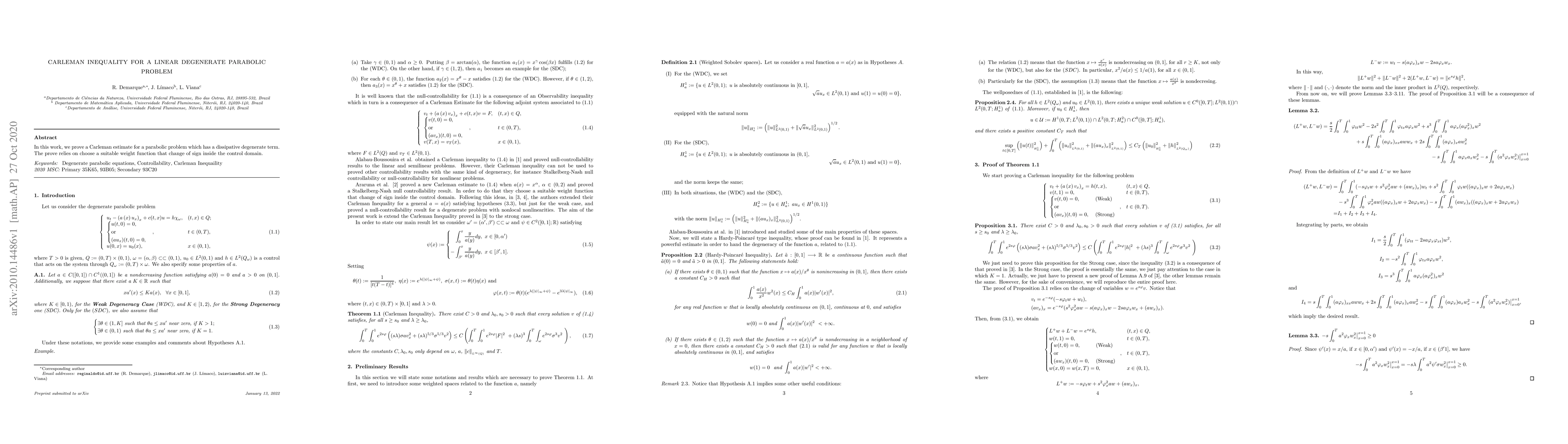 This research paper proves a Carleman estimate for a parabolic problem with dissipative degenerate term, using a suitable weight function to change sign inside the control domain.