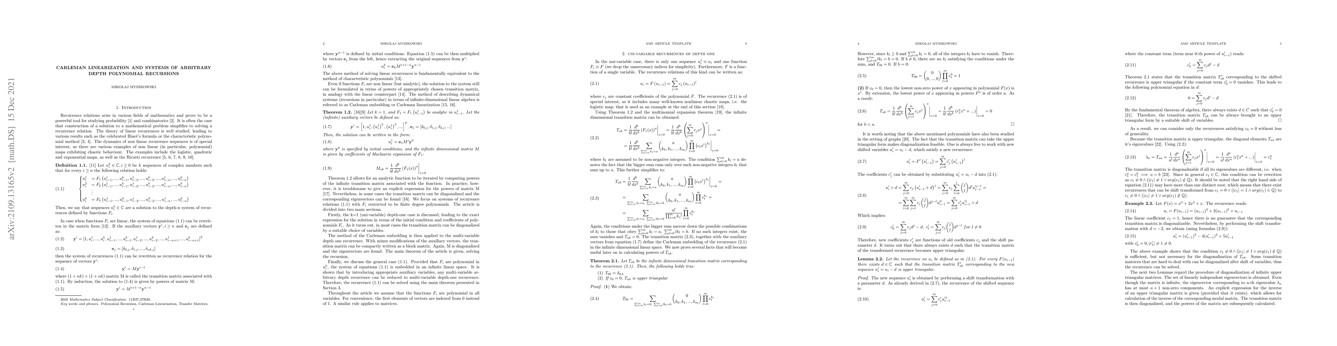 This paper develops a new Carleman linearization approach for systems of polynomial recursions, initially focusing on uni-variable depth-one recurrences and then extending to systems of arbitrary depth. It constructs and upper triangularizes transition matrices, deriving explicit solutions for broad recurrence families and discussing sufficient conditions for the method's applicability.