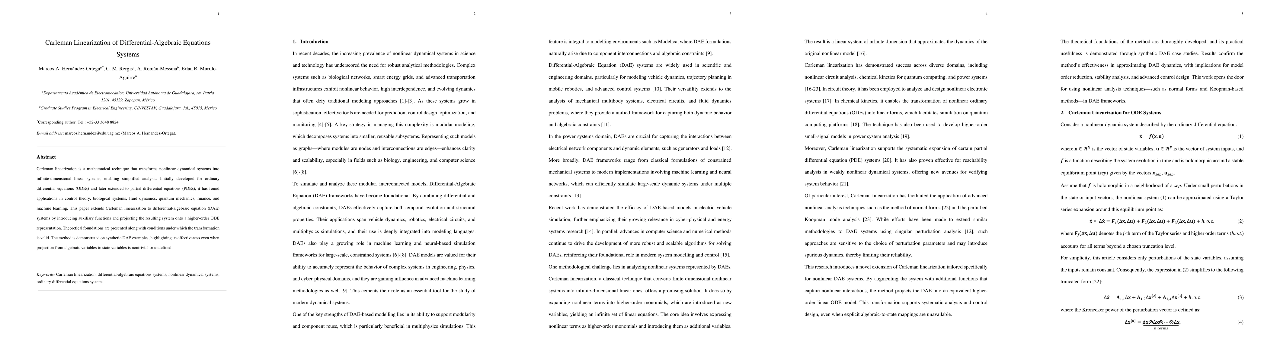 Carleman linearization is a mathematical technique that transforms nonlinear dynamical systems into infinite-dimensional linear systems, enabling simplified analysis. Initially developed for ordinary differential equations (ODEs) and later extended to partial differential equations (PDEs), it has found applications in control theory, biological systems, fluid dynamics, quantum mechanics, finance, and machine learning. This paper extends Carleman linearization to differential-algebraic equation (DAE) systems by introducing auxiliary functions and projecting the resulting system onto a higher-order ODE representation. Theoretical foundations are presented along with conditions under which the transformation is valid. The method is demonstrated on synthetic DAE examples, highlighting its effectiveness even when projection from algebraic variables to state variables is nontrivial or undefined.