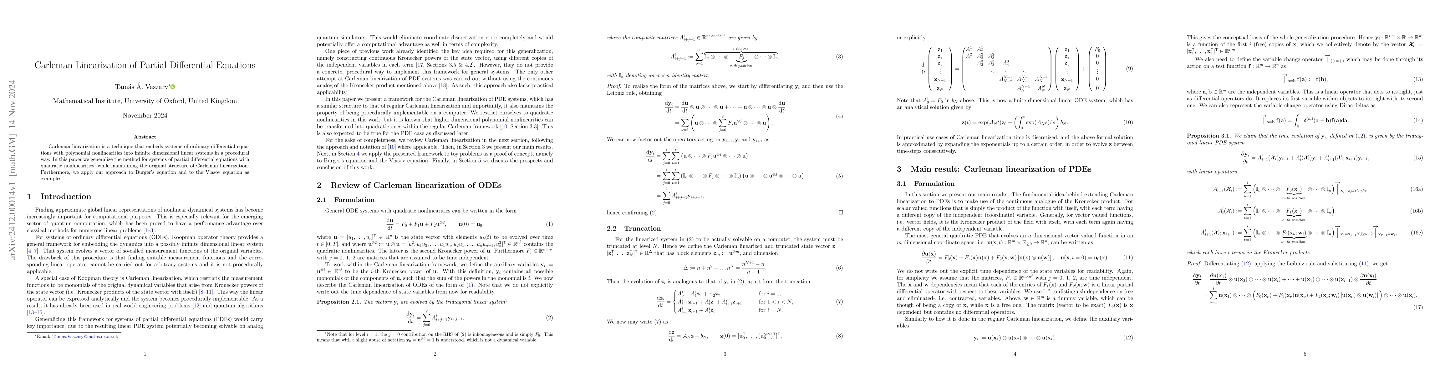 This paper generalizes Carleman linearization for partial differential equations with quadratic nonlinearities, maintaining the original method's structure, and demonstrates its application to Burger's and Vlasov equations.