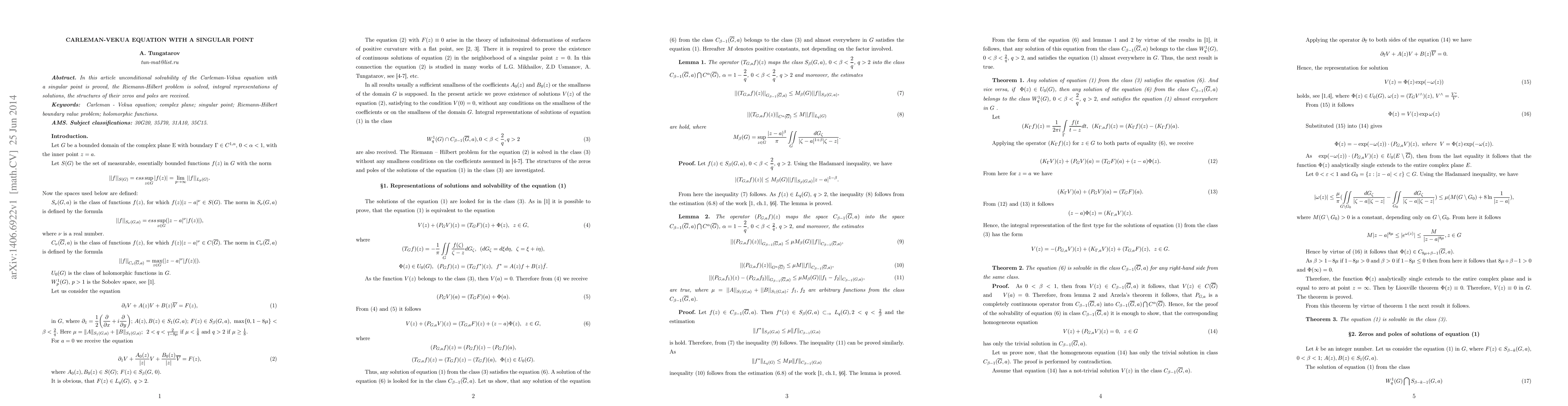 In this article uncoditional solvability of the Carleman-Vekua equation with a singular point is proved, the Riemann-Hilbert problem is solved integral representations of solutions, the strictures of their zeros and poles are recieved.