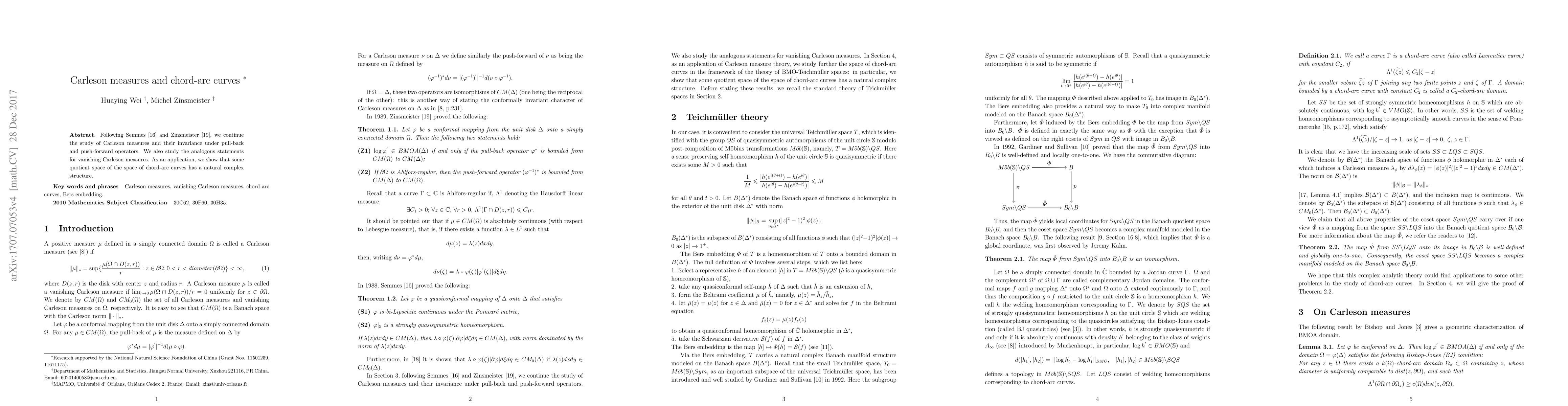 Following Semmes and Zinsmeister, we continue the study of Carleson measures and their invariance under pull-back and push-forward operators. We also study the analogous statements for vanishing Carleson measures. As an application, we show that some quotient space of the space of chord-arc curves has a natural complex structure.