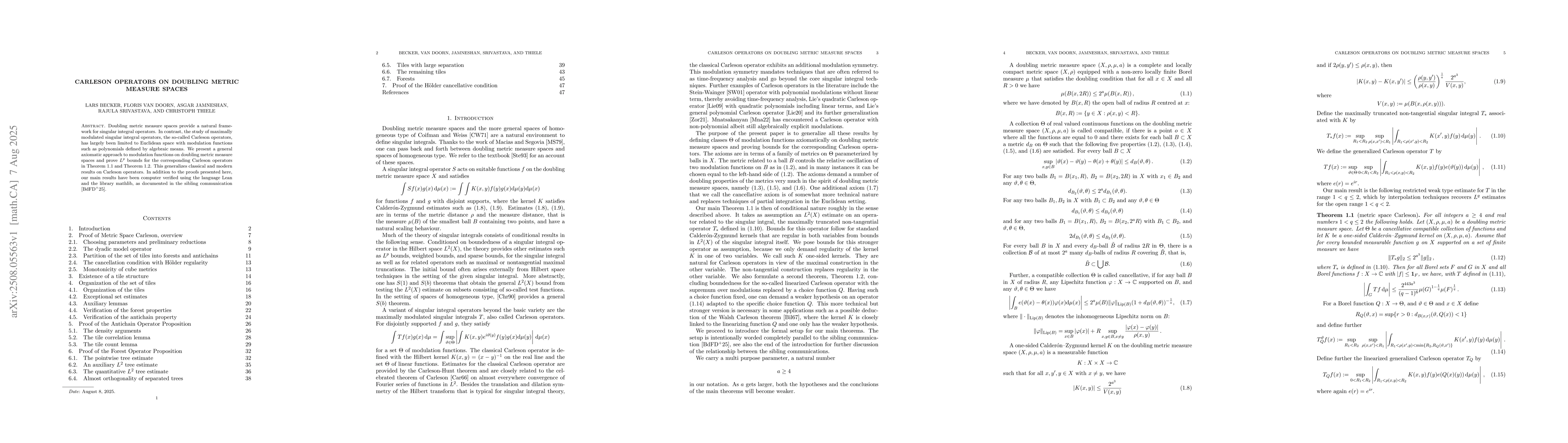 Doubling metric measure spaces provide a natural framework for singular integral operators. In contrast, the study of maximally modulated singular integral operators, the so-called Carleson operators, has largely been limited to Euclidean space with modulation functions such as polynomials defined by algebraic means. We present a general axiomatic approach to modulation functions on doubling metric measure spaces and prove $L^p$ bounds for the corresponding Carleson operators in Theorem 1.1 and Theorem 1.2. This generalizes classical and modern results on Carleson operators. In addition to the proofs presented here, our main results have been computer verified using the language Lean and the library mathlib, as documented in the sibling communication arXiv:2405.06423.