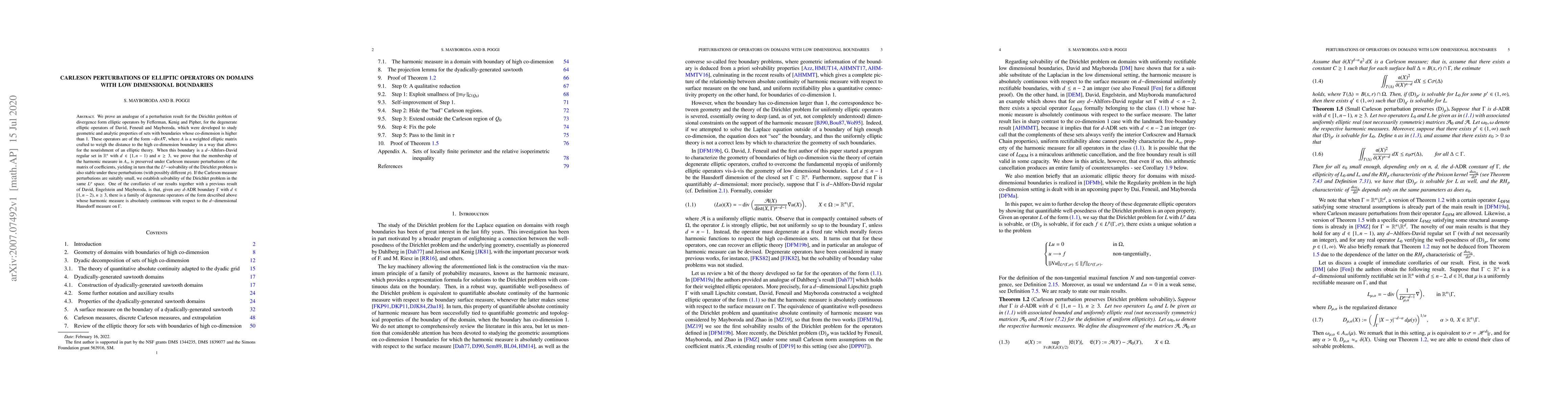 We prove an analogue of a perturbation result for the Dirichlet problem of divergence form elliptic operators by Fefferman, Kenig and Pipher, for the degenerate elliptic operators of David, Feneuil and Mayboroda, which were developed to study geometric and analytic properties of sets with boundaries whose co-dimension is higher than $1$. These operators are of the form $-\text{div} A\nabla$, where $A$ is a weighted elliptic matrix crafted to weigh the distance to the high co-dimension boundary in a way that allows for the nourishment of an elliptic theory. When this boundary is a $d-$Alhfors-David regular set in $\mathbb R^n$ with $d\in[1,n-1)$ and $n\geq3$, we prove that the membership of the harmonic measure in $A_{\infty}$ is preserved under Carleson measure perturbations of the matrix of coefficients, yielding in turn that the $L^p-$solvability of the Dirichlet problem is also stable under these perturbations (with possibly different $p$). If the Carleson measure perturbations are suitably small, we establish solvability of the Dirichlet problem in the same $L^p$ space. One of the corollaries of our results together with a previous result of David, Engelstein and Mayboroda, is that, given any $d$-ADR boundary $\Gamma$ with $d\in[1,n-2)$, $n\geq3$, there is a family of degenerate operators of the form described above whose harmonic measure is absolutely continuous with respect to the $d-$dimensional Hausdorff measure on $\Gamma$.