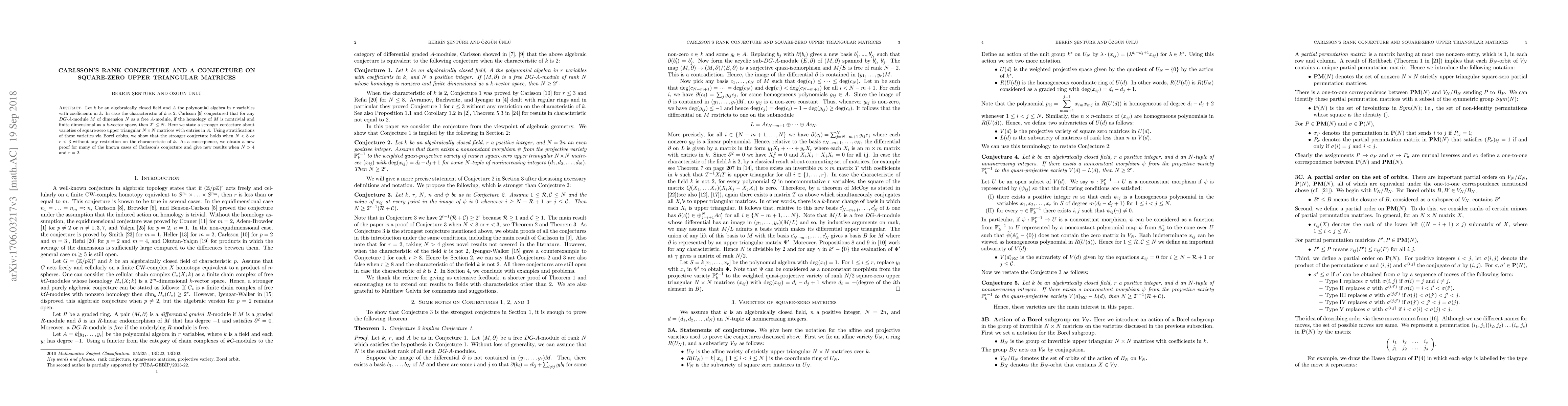 Let $k$ be an algebraically closed field and $A$ the polynomial algebra in $r$ variables with coefficients in $k$. In case the characteristic of $k$ is $2$, Carlsson conjectured that for any $DG$-$A$-module $M$ of dimension $N$ as a free $A$-module, if the homology of $M$ is nontrivial and finite dimensional as a $k$-vector space, then $2^r\leq N$. Here we state a stronger conjecture about varieties of square-zero upper-triangular $N\times N$ matrices with entries in $A$. Using stratifications of these varieties via Borel orbits, we show that the stronger conjecture holds when $N < 8$ or $r < 3$ without any restriction on the characteristic of $k$. As a consequence, we attain a new proof for many of the known cases of Carlsson's conjecture and give new results when $N > 4$ and $r = 2$.