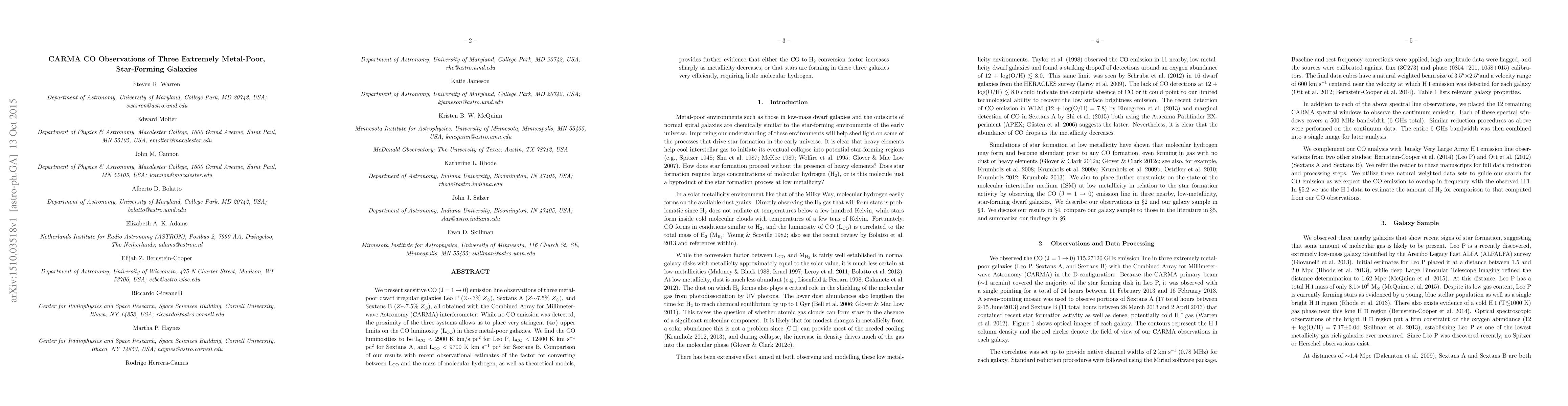 This study uses CARMA to observe CO emissions in three extremely metal-poor dwarf galaxies, finding no CO emission but setting stringent upper limits on CO luminosity. The results suggest either a sharp increase in the CO-to-H_2 conversion factor at low metallicity or highly efficient star formation requiring minimal molecular hydrogen.