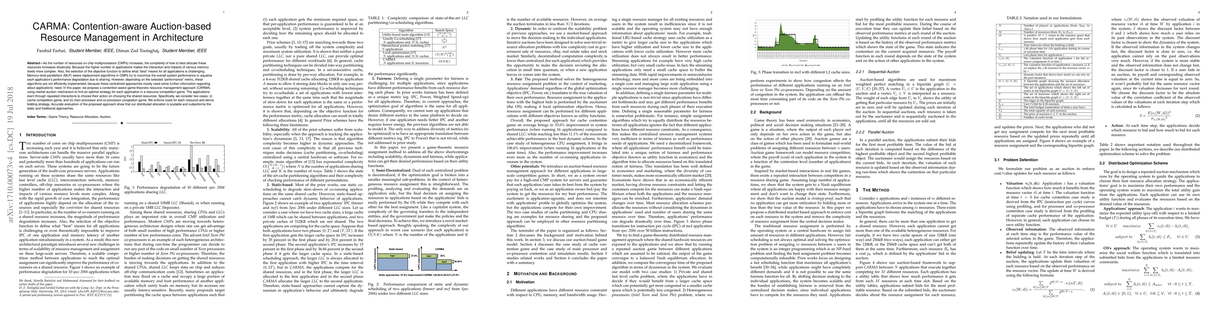 As the number of resources on chip multiprocessors (CMPs) increases, the complexity of how to best allocate these resources increases drastically. Because the higher number of applications makes the interaction and impacts of various memory levels more complex. Also, the selection of the objective function to define what \enquote{best} means for all applications is challenging. Memory-level parallelism (MLP) aware replacement algorithms in CMPs try to maximize the overall system performance or equalize each application's performance degradation due to sharing. However, depending on the selected \enquote{performance} metric, these algorithms are not efficiently implemented, because these centralized approaches mostly need some further information regarding about applications' need. In this paper, we propose a contention-aware game-theoretic resource management approach (CARMA) using market auction mechanism to find an optimal strategy for each application in a resource competition game. The applications learn through repeated interactions to choose their action on choosing the shared resources. Specifically, we consider two cases: (i) cache competition game, and (ii) main processor and co-processor congestion game. We enforce costs for each resource and derive bidding strategy. Accurate evaluation of the proposed approach show that our distributed allocation is scalable and outperforms the static and traditional approaches.