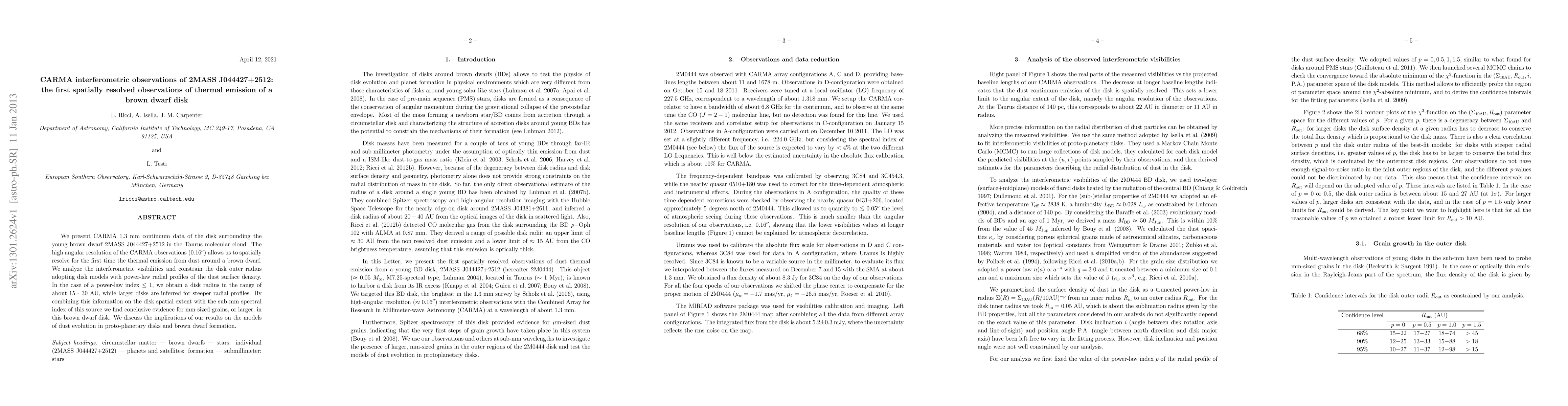 We present CARMA 1.3 mm continuum data of the disk surrounding the young brown dwarf 2MASS J044427+2512 in the Taurus molecular cloud. The high angular resolution of the CARMA observations (0.16 arcsec) allows us to spatially resolve for the first time the thermal emission from dust around a brown dwarf. We analyze the interferometric visibilities and constrain the disk outer radius adopting disk models with power-law radial profiles of the dust surface density. In the case of a power-law index equal to or lower than 1, we obtain a disk radius in the range of about 15 - 30 AU, while larger disks are inferred for steeper radial profiles. By combining this information on the disk spatial extent with the sub-mm spectral index of this source we find conclusive evidence for mm-sized grains, or larger, in this brown dwarf disk. We discuss the implications of our results on the models of dust evolution in proto-planetary disks and brown dwarf formation.