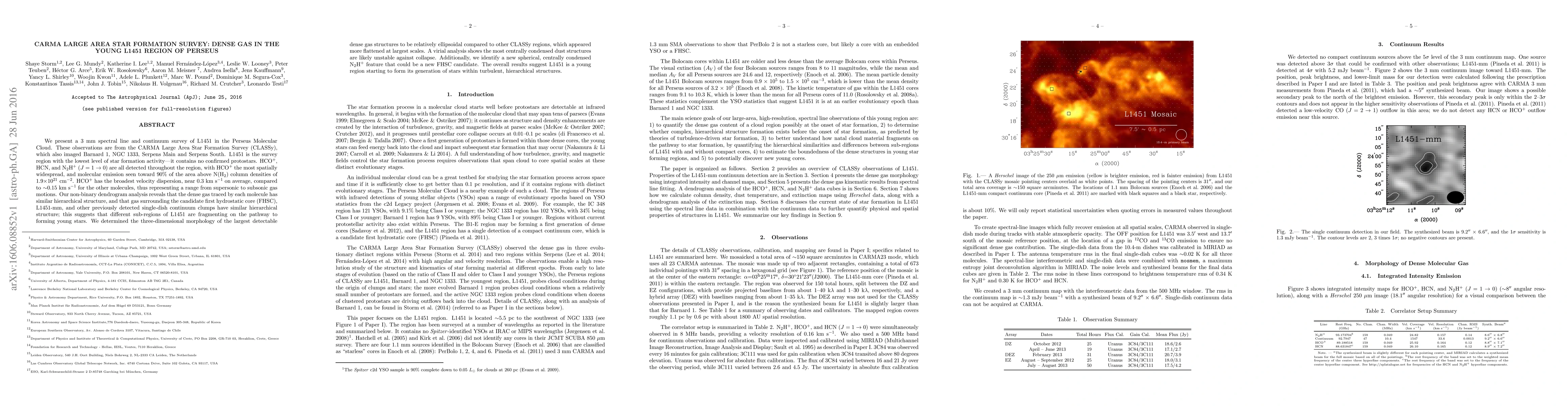 We present a 3 mm spectral line and continuum survey of L1451 in the Perseus Molecular Cloud. These observations are from the CARMA Large Area Star Formation Survey (CLASSy), which also imaged Barnard 1, NGC 1333, Serpens Main and Serpens South. L1451 is the survey region with the lowest level of star formation activity---it contains no confirmed protostars. HCO+, HCN, and N2H+ (J=1-0) are all detected throughout the region, with HCO+ the most spatially widespread, and molecular emission seen toward 90% of the area above N(H_2) column densities of 1.9x10^21 cm^-2. HCO+ has the broadest velocity dispersion, near 0.3 km/s on average, compared to ~0.15 km/s for the other molecules, thus representing a range from supersonic to subsonic gas motions. Our non-binary dendrogram analysis reveals that the dense gas traced by each molecule has similar hierarchical structure, and that gas surrounding the candidate first hydrostatic core (FHSC), L1451-mm, and other previously detected single-dish continuum clumps have similar hierarchical structure; this suggests that different sub-regions of L1451 are fragmenting on the pathway to forming young stars. We determined the three-dimensional morphology of the largest detectable dense gas structures to be relatively ellipsoidal compared to other CLASSy regions, which appeared more flattened at largest scales. A virial analysis shows the most centrally condensed dust structures are likely unstable against collapse. Additionally, we identify a new spherical, centrally condensed N2H+ feature that could be a new FHSC candidate. The overall results suggest L1451 is a young region starting to form its generation of stars within turbulent, hierarchical structures.