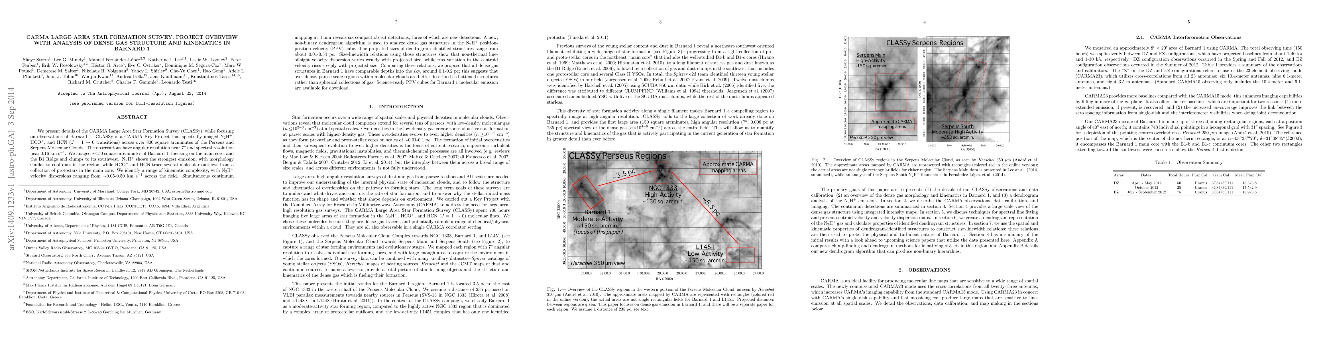 The CARMA Large Area Star Formation Survey (CLASSy) focuses on dense gas structure and kinematics in Barnard 1, revealing complex molecular outflows and protostars. The study proposes that over-dense regions in molecular clouds are flattened rather than spherical.