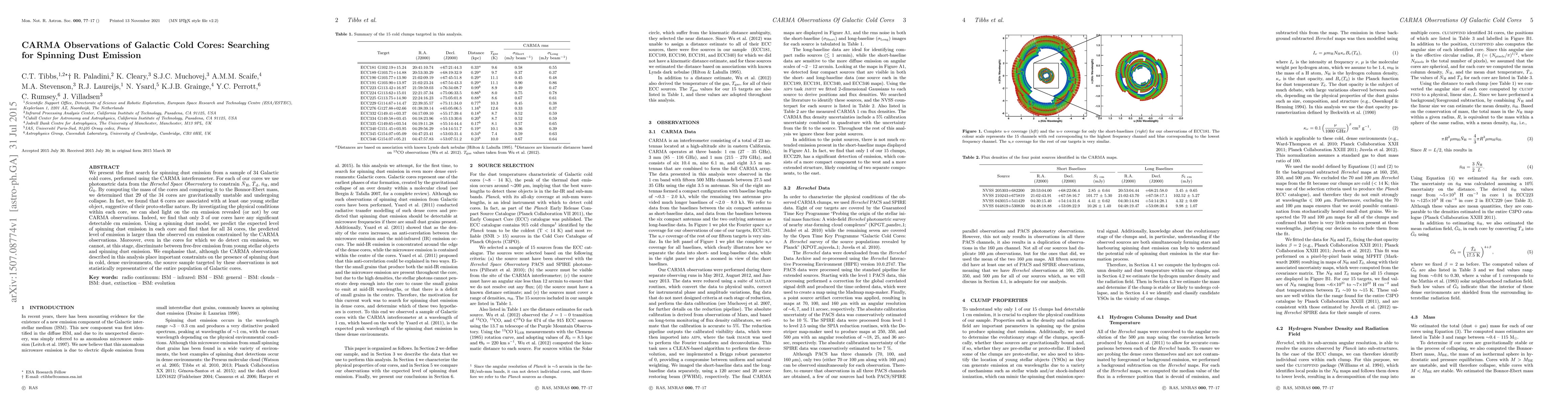 We present the first search for spinning dust emission from a sample of 34 Galactic cold cores, performed using the CARMA interferometer. For each of our cores we use photometric data from the Herschel Space Observatory to constrain N_{H}, T_{d}, n_{H}, and G_{0}. By computing the mass of the cores and comparing it to the Bonnor-Ebert mass, we determined that 29 of the 34 cores are gravitationally unstable and undergoing collapse. In fact, we found that 6 cores are associated with at least one young stellar object, suggestive of their proto-stellar nature. By investigating the physical conditions within each core, we can shed light on the cm emission revealed (or not) by our CARMA observations. Indeed, we find that only 3 of our cores have any significant detectable cm emission. Using a spinning dust model, we predict the expected level of spinning dust emission in each core and find that for all 34 cores, the predicted level of emission is larger than the observed cm emission constrained by the CARMA observations. Moreover, even in the cores for which we do detect cm emission, we cannot, at this stage, discriminate between free-free emission from young stellar objects and spinning dust emission. We emphasise that, although the CARMA observations described in this analysis place important constraints on the presence of spinning dust in cold, dense environments, the source sample targeted by these observations is not statistically representative of the entire population of Galactic cores.
