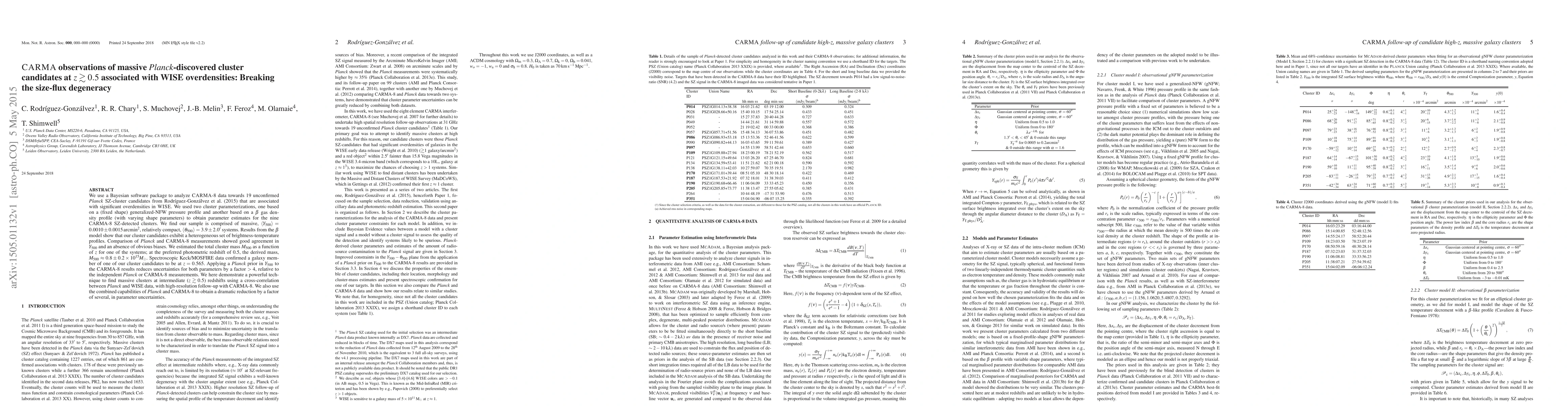 We use a Bayesian software package to analyze CARMA-8 data towards 19 unconfirmed Planck SZ-cluster candidates from Rodriguez-Gonzalvez et al. (2015), that are associated with significant overdensities in WISE. We used two cluster parameterizations, one based on a (fixed shape) generalized-NFW pressure profile and another based on a beta-gas-density profile (with varying shape parameters) to obtain parameter estimates for the nine CARMA-8 SZ-detected clusters. We find our sample is comprised of massive, Y_{500}=0.0010 \pm 0.0015 arcmin^2, relatively compact, theta_{500}= 3.9 \pm 2.0 arcmin systems. Results from the beta model show that our cluster candidates exhibit a heterogeneous set of brightness-temperature profiles. Comparison of Planck and CARMA-8 measurements showed good agreement in Y_{500} and an absence of obvious biases. We estimated the total cluster mass M_{500} as a function of z for one of the systems; at the preferred photometric redshift of 0.5, the derived mass, M_{500} \approx 0.8 \pm 0.2 \times 10^{15} Msun. Spectroscopic Keck/MOSFIRE data confirmed a galaxy member of one of our cluster candidates to be at z=0.565. Applying a Planck prior in Y_{500} to the CARMA-8 results reduces uncertainties for both parameters by a factor >4, relative to the independent Planck or CARMA-8 measurements. We here demonstrate a powerful technique to find massive clusters at intermediate z \gtrsim 0.5 redshifts using a cross-correlation between Planck and WISE data, with high-resolution follow-up with CARMA-8. We also use the combined capabilities of Planck and CARMA-8 to obtain a dramatic reduction by a factor of several, in parameter uncertainties.