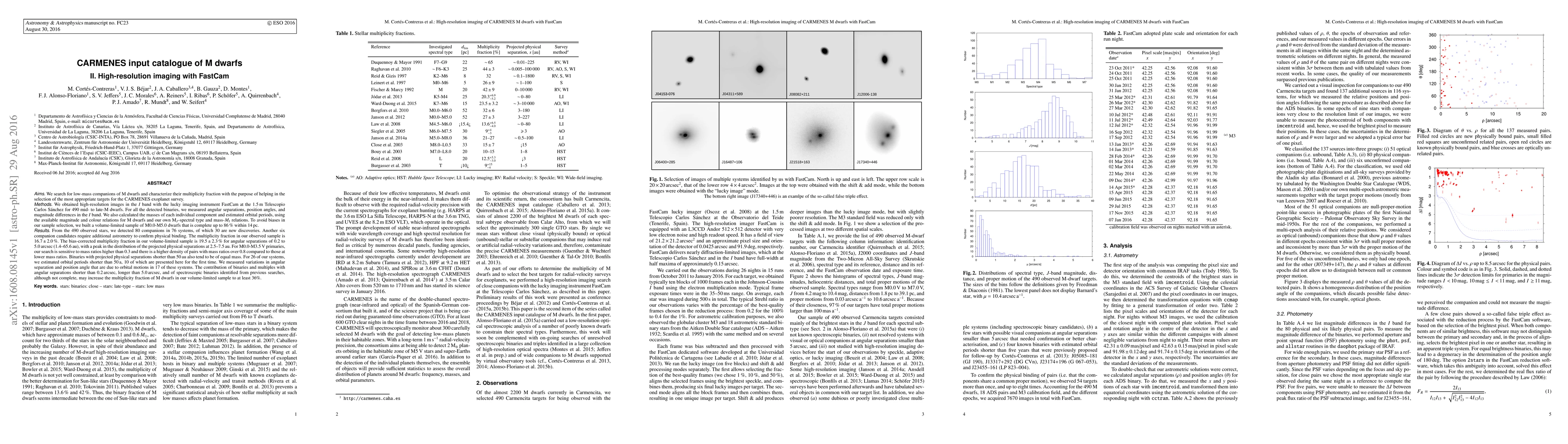 Aims: We search for low-mass companions of M dwarfs and characterize their multiplicity fraction with the purpose of helping in the selection of the most appropriate targets for the CARMENES exoplanet survey. Methods: We obtained high-resolution images in the I band with the lucky imaging instrument FastCam at the 1.5 m Telescopio Carlos Sanchez for 490 mid- to late-M dwarfs. For all the detected binaries, we measured angular separations, position angles, and magnitude differences in the I band. We also calculated the masses of each individual component and estimated orbital periods, using the available magnitude and colour relations for M dwarfs and our own MJ-spectral type and mass-MI relations. To avoid biases in our sample selection, we built a volume-limited sample of M0.0-M5.0 dwarfs that is complete up to 86% within 14 pc. Results: From the 490 observed stars, we detected 80 companions in 76 systems, of which 30 are new discoveries. The multiplicity fraction in our observed sample is 16.7+-2.0% . In our volume-limited sample it is 19.5+-2.3% for angular separations of 0.2 to 5.0 arcsec (1.4-65.6 au), The distribution of the projected physical separations peaks at 2.5-7.5 au. For M0.0-M3.5 V primaries, our search is sensitive to mass ratios higher than 0.3. Binaries with projected physical separations shorter than 50 au tend to be of equal mass. For 26 of our systems, we estimated orbital periods shorter than 50 a, 10 of which are presented here for the first time. We measured variations in angular separation and position angle that are due to orbital motions in 17 of these systems. The contribution of binaries and multiples with angular separations shorter than 0.2 arcsec, longer than 5.0 arcsec, and of spectroscopic binaries identified from previous searches, although not complete, may increase the multiplicity fraction of M dwarfs in our volume-limited sample to at least 36%.