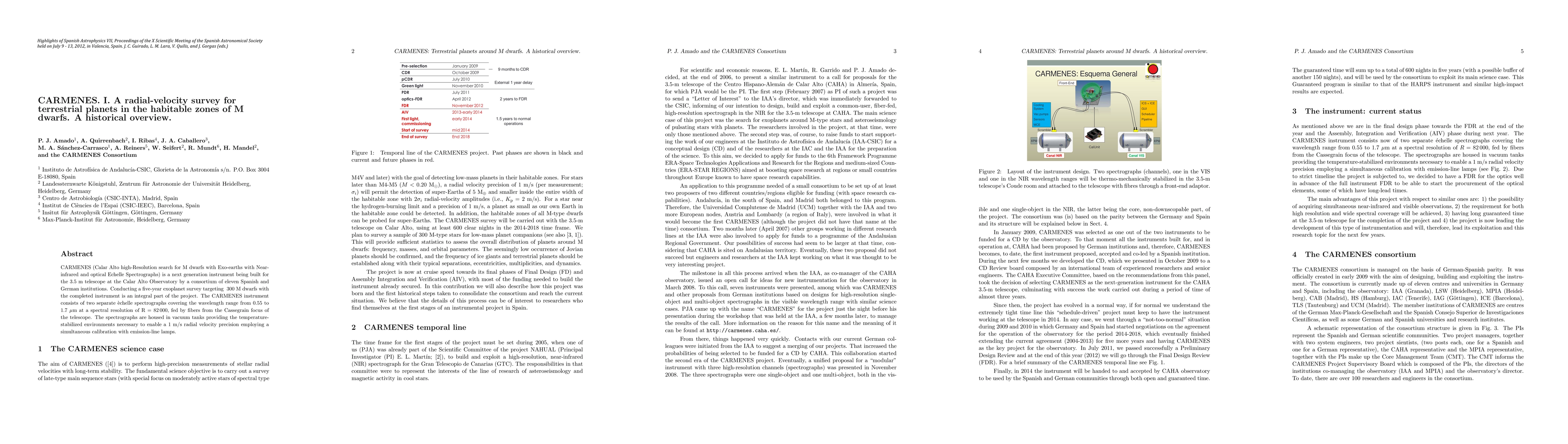 CARMENES is a next-generation instrument designed to survey M dwarfs for terrestrial planets in their habitable zones, aiming for a five-year radial-velocity survey of 300 stars. The instrument features two echelle spectrographs with high spectral resolution and precision for detecting potential exoplanets.