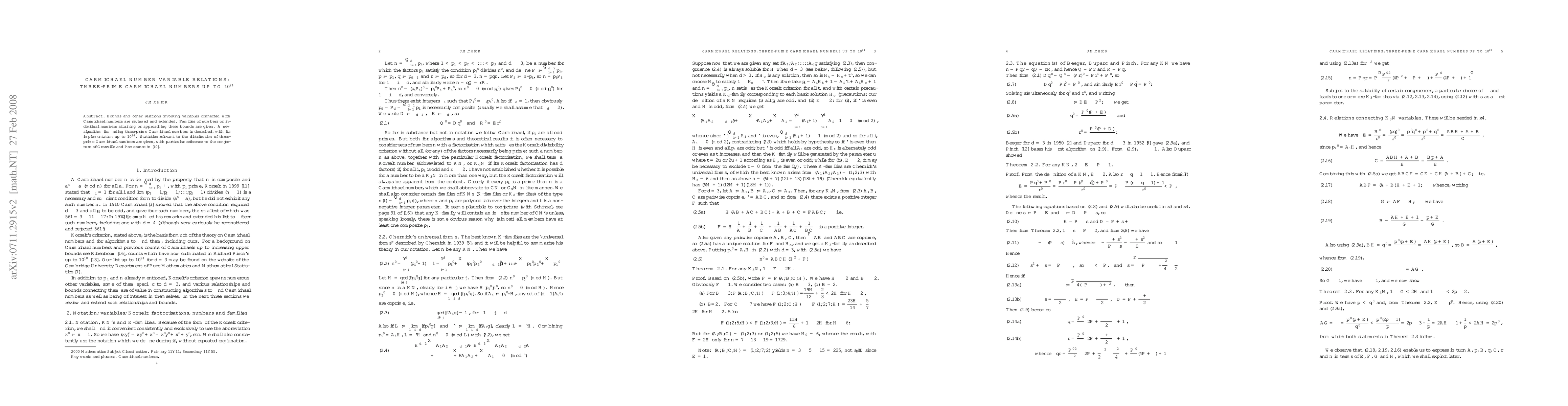 This paper reviews and extends bounds for Carmichael numbers, focusing on three-prime Carmichael numbers up to $10^{24}$. It introduces a new algorithm for finding these numbers and provides statistical insights into their distribution, addressing the conjectures of Granville and Pomerance.