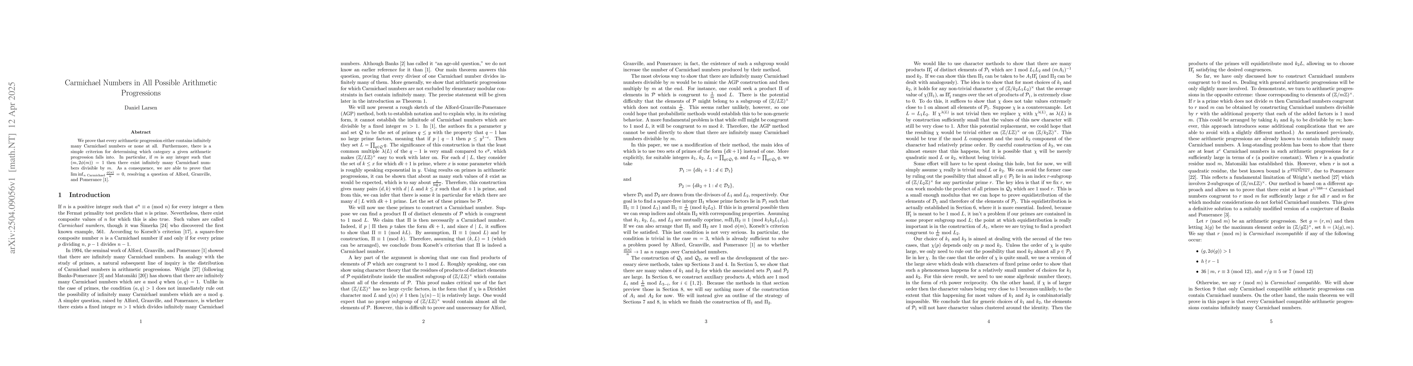Researchers prove that every arithmetic progression contains either infinitely many or no Carmichael numbers at all. They also find a simple criterion to determine which category an arithmetic progression falls into, with implications for understanding the distribution of Carmichael numbers.