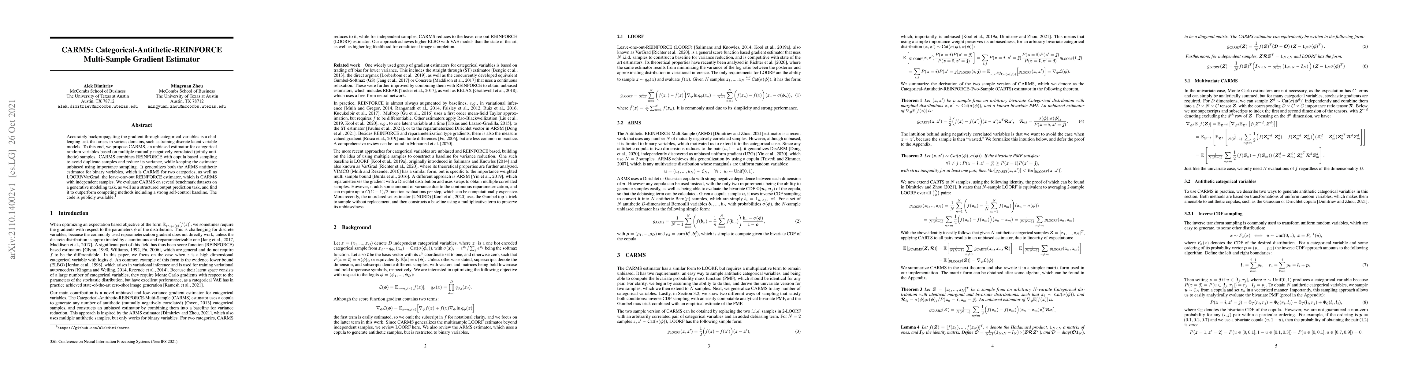 CARMS is an unbiased gradient estimator for categorical variables that leverages antithetic sampling and REINFORCE to reduce variance and improve accuracy in training discrete latent variable models. It outperforms other methods in generative modeling and structured output prediction tasks.