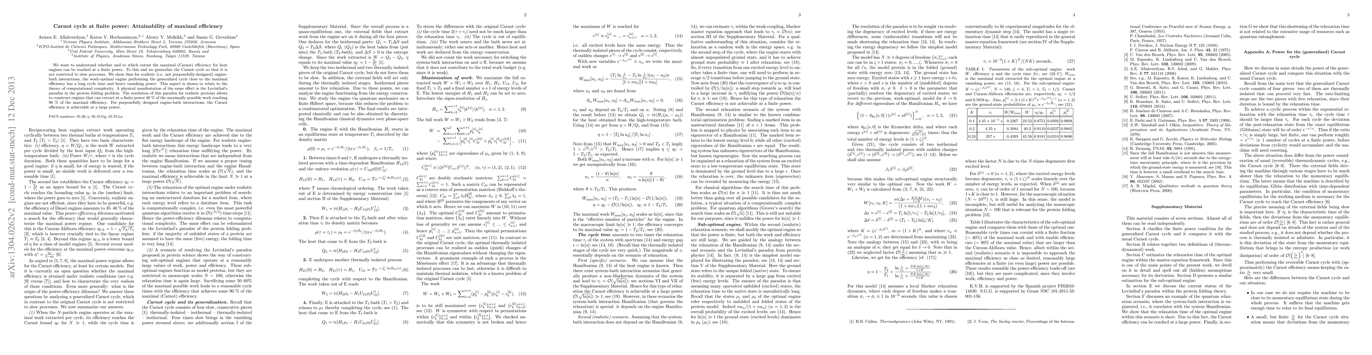 We want to understand whether and to which extent the maximal (Carnot) efficiency for heat engines can be reached at a finite power. To this end we generalize the Carnot cycle so that it is not restricted to slow processes. We show that for realistic (i.e. not purposefully-designed) engine-bath interactions, the work-optimal engine performing the generalized cycle close to the maximal efficiency has a long cycle time and hence vanishing power. This aspect is shown to relate to the theory of computational complexity. A physical manifestation of the same effect is the Levinthal's paradox in the protein folding problem. The resolution of this paradox for realistic proteins allows to construct engines that can extract at a finite power 40% of the maximally possible work reaching 90% of the maximal efficiency. For purposefully designed engine-bath interactions, the Carnot efficiency is achievable at a large power.