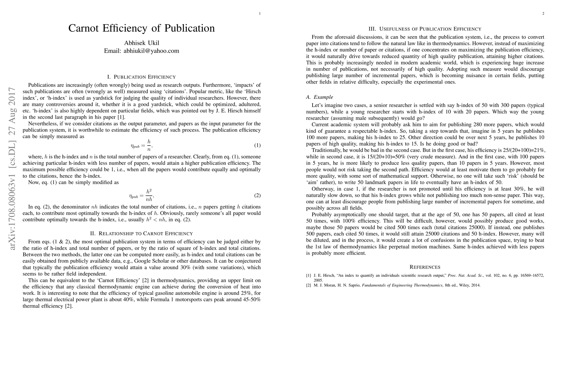 This work is novel in its application of thermodynamic efficiency principles to evaluate publication quality and quantity, proposing a new metric (publication efficiency) to guide researchers and institutions towards producing high-impact, fewer publications.