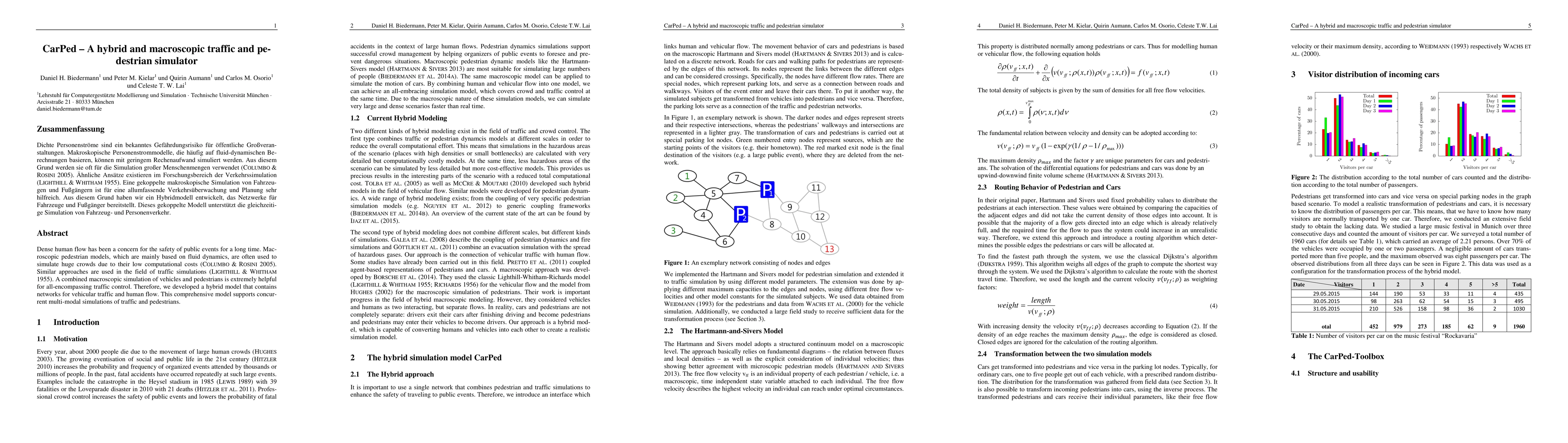 The CarPed simulator integrates macroscopic traffic and pedestrian models to efficiently simulate large crowds and vehicle flows, aiding comprehensive traffic control and safety management in public events. This hybrid model combines fluid dynamics-based approaches for both traffic and pedestrian simulations for effective multi-modal analysis.
